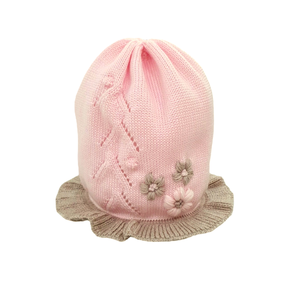 Il cappellino è un capo di qualità, realizzato in lana merino 100%. Il ricamo di fiori è delicato e rende il cappellino ancora più prezioso. Ulteriori dettagli quali le rouches di lana sul profilo color tortora, rendono questo capo unico ed esclusivo.