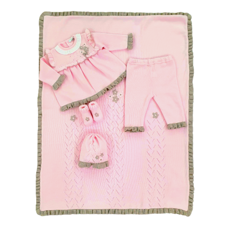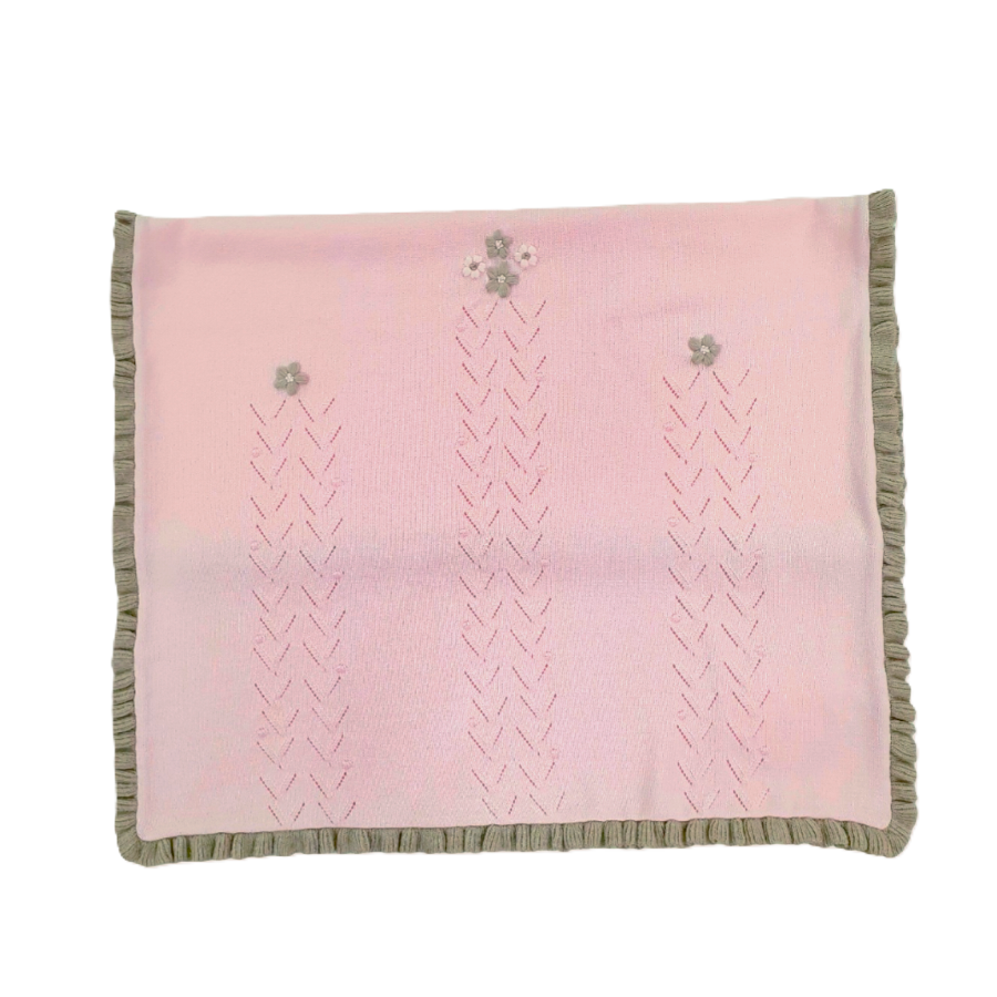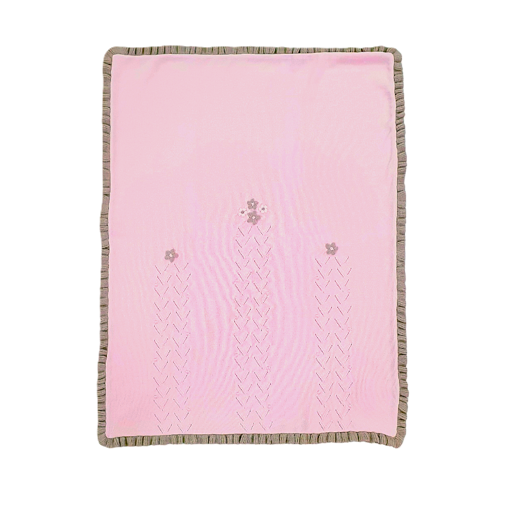 Realizzata in pura lana merino extrafine, questa copertina unisce morbidezza e calore naturali per il massimo comfort. Il delicato ricamo a mano di fiorellini color tortora e le rouches applicate lungo il profilo donano un tocco elegante e raffinato. Al centro, un disegno traforato a spighe aggiunge un dettaglio unico e sofisticato. Con una misura di 90 cm x 75 cm, è perfetta per avvolgere dolcemente i tuoi momenti più preziosi. Scegli la qualità e la bellezza artigianale per coccolare chi ami.