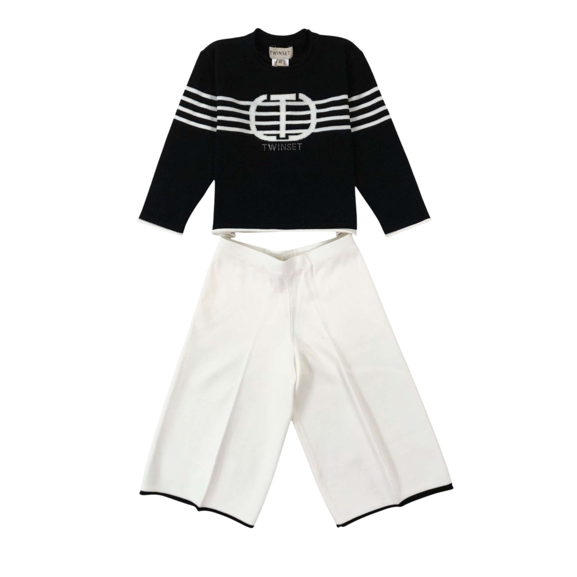 Eleganza senza tempo con questo completo nero, arricchito da pantaloni gaucho bianco off che creano un contrasto raffinato. La maglia, realizzata in viscosa e poliestere, garantisce comfort e leggerezza, con un design a righe centrali e l’iconico ricamo logo oval T al centro aggiunge un tocco di stile distintivo. Perfetto per chi desidera un look sofisticato e versatile, ideale per ogni occasione.