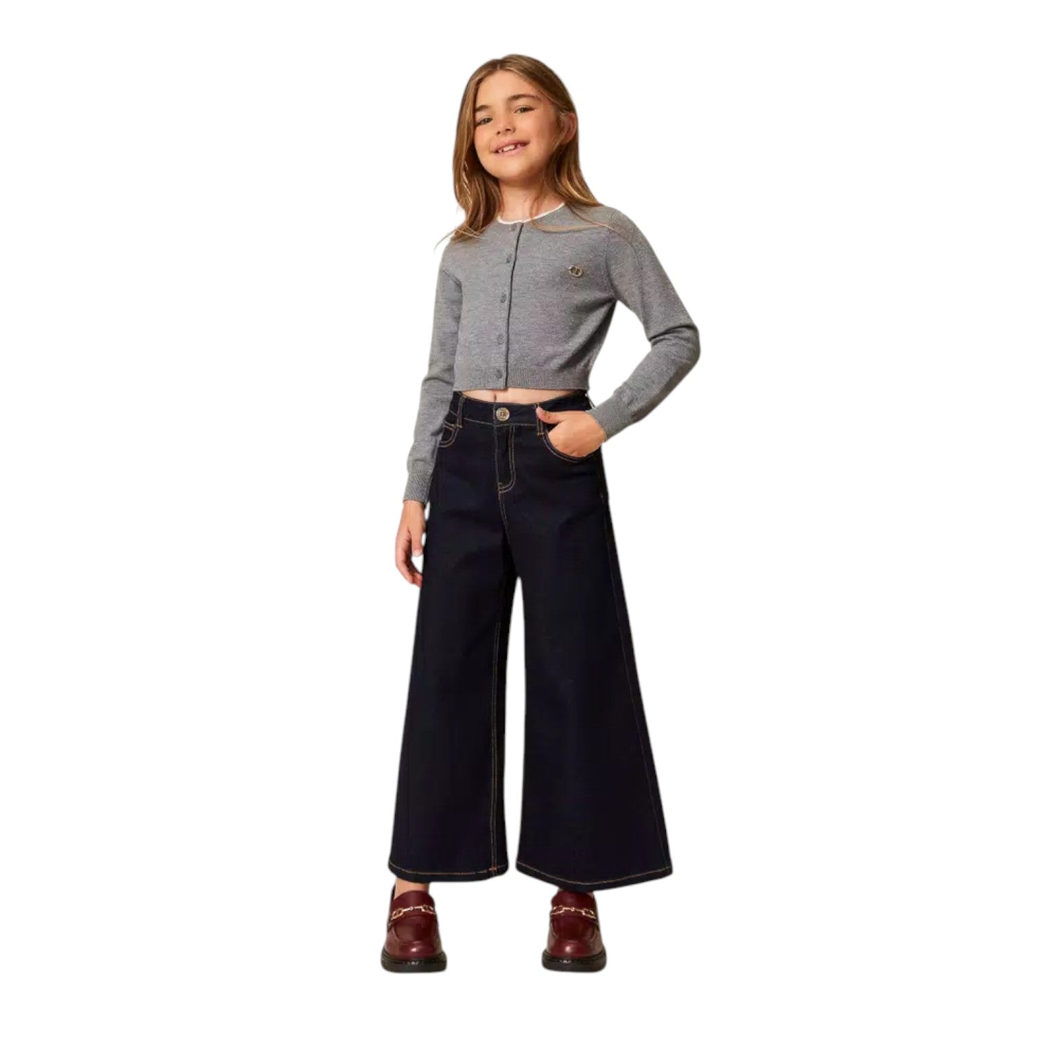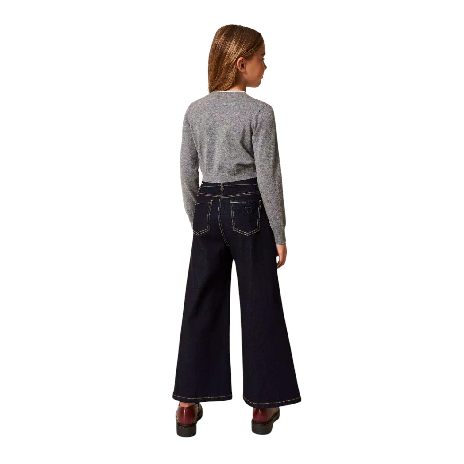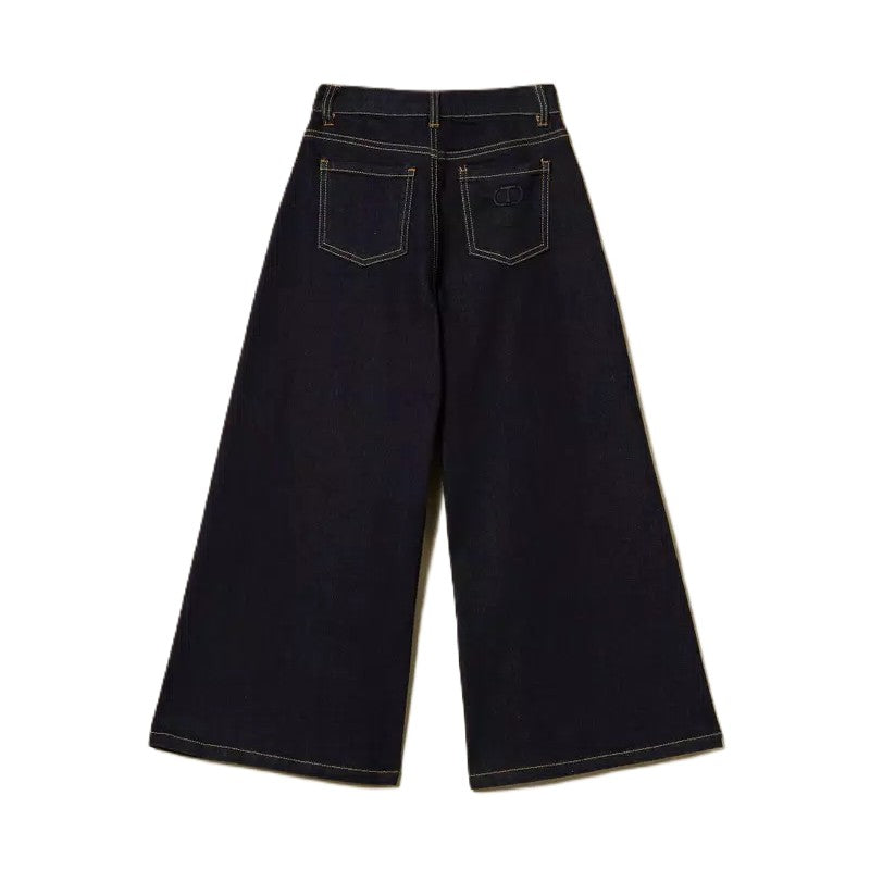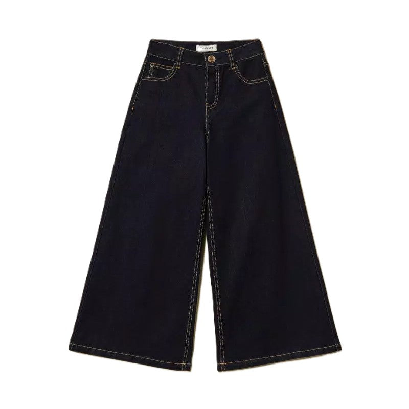 Questi jeans wide leg da bambina, realizzati in puro cotone, uniscono comfort e stile. La chiusura con zip e bottone logato garantisce praticità, mentre i passanti in vita permettono di abbinare facilmente una cintura. Il lavaggio rinse esalta il colore autentico del denim, arricchito dalle impunture color tabacco. Con cinque comode tasche, sono perfetti per accompagnare ogni movimento quotidiano con un tocco di tendenza.