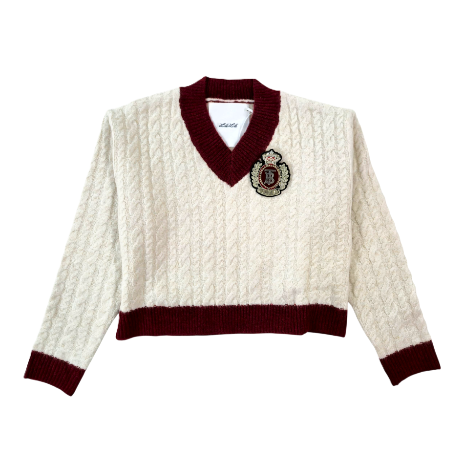 Il pullover a punta si distingue per le trecce di varie dimensioni che conferiscono dinamismo e stile. I dettagli a coste in bordeaux su polsi e collo aggiungono un raffinato contrasto di colore, mentre la spilla applicata sulla parte alta sinistra dona un tocco esclusivo di college Inglese. Realizzato in poliestere e misto lana sintetica, offre un equilibrio perfetto tra comfort e calore, rendendolo ideale per chi cerca un capo elegante e funzionale.