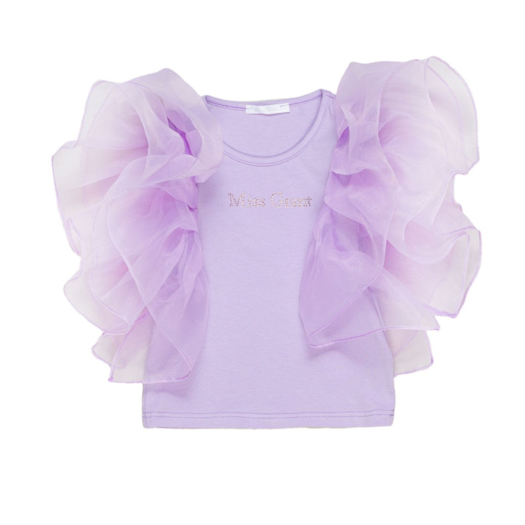 Questa T-shirt Miss Grant é realizzata in cotone stretch, offrendo un comfort e una vestibilitá ottimali. Con volant in tulle sulle spalle, é un pezzo elegante e alla moda. Il logo strassato sul petto rende il design unico e raffinato. Perfetta per ogni occasione.