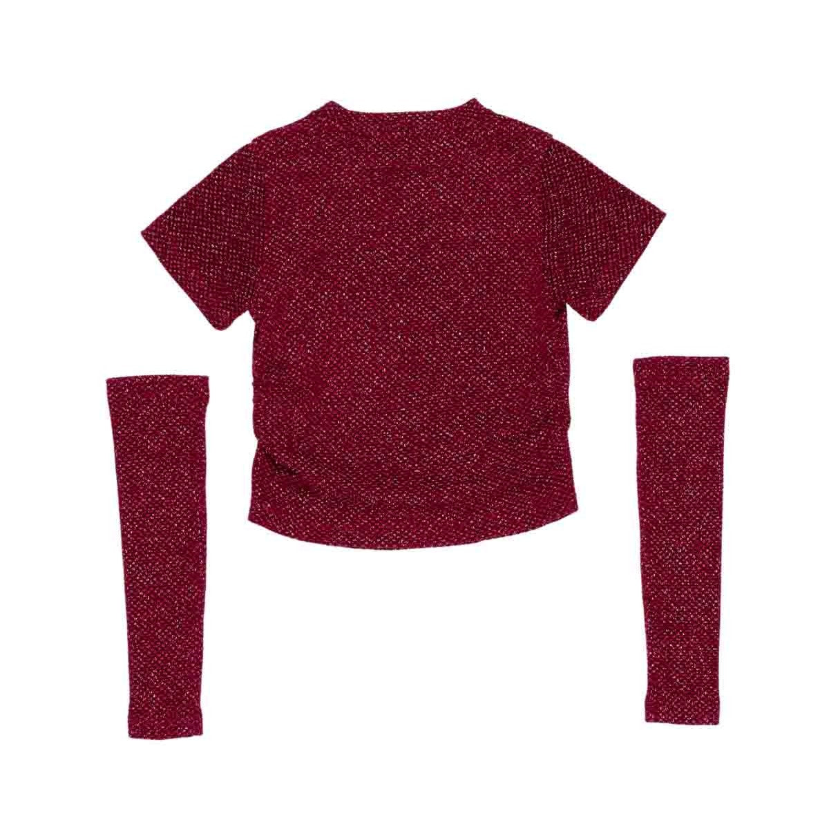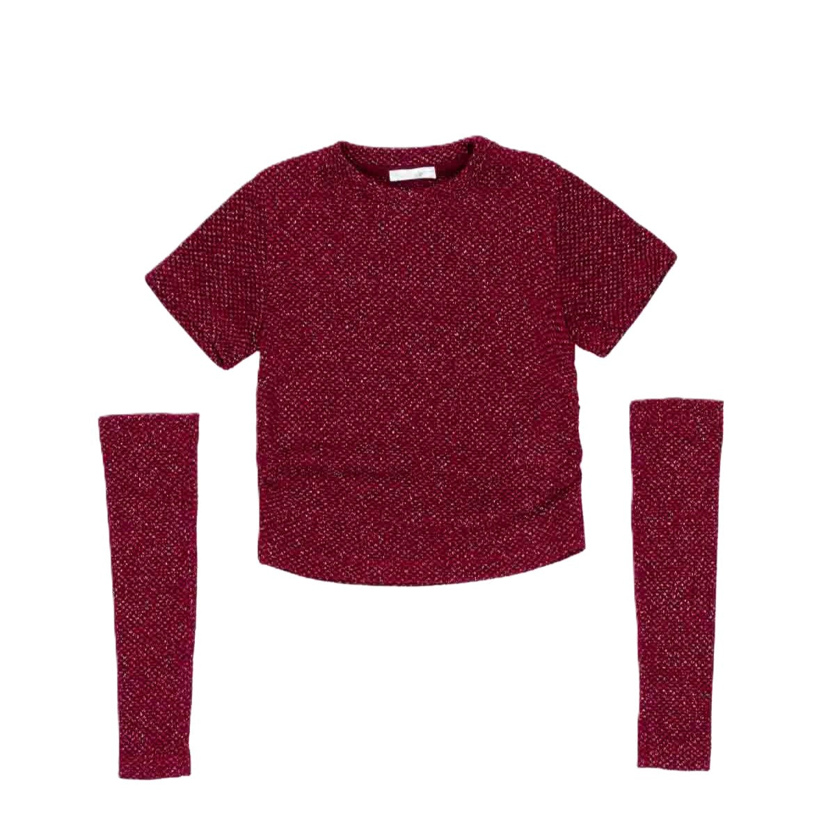 La T-shirt Girl in tessuto lurex unisce raffinatezza e modernità grazie al pregiato poliestere lurex dal design a grana di riso. Le maniche corte con manicotti donano un tocco di originalità, rendendola perfetta per chi vuole distinguersi con eleganza e stile in ogni occasione.