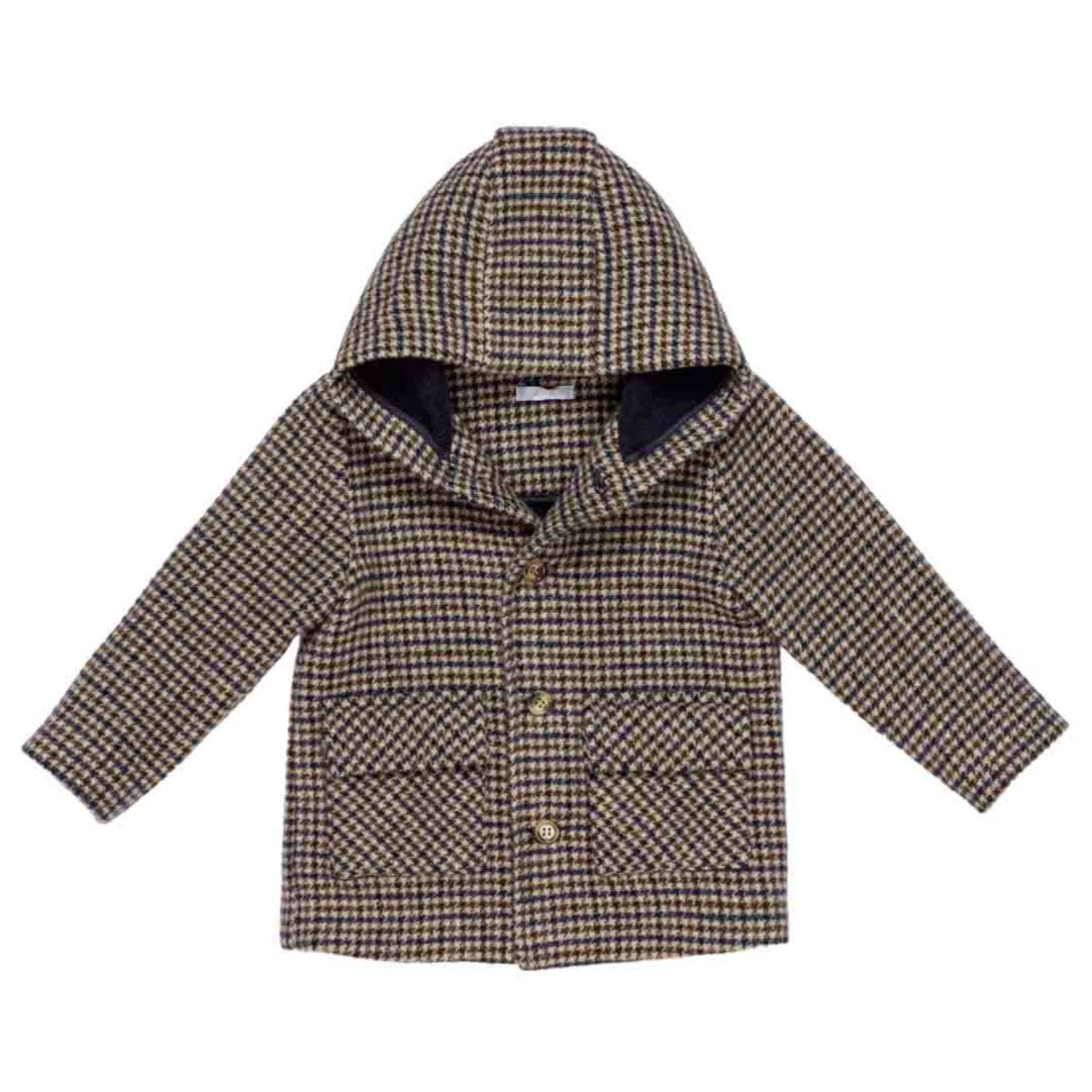 Questo elegante cappotto baby in pied de poul blu e marrone unisce stile e praticità per proteggere il tuo bambino nelle giornate fredde. Realizzato in un caldo misto lana e poliestere, dispone di cappuccio e chiusura con bottoni per un comfort ottimale. Le tasche frontali con patta aggiungono un tocco funzionale e raffinato, ideale per mantenere le mani al caldo o riporre piccoli oggetti. Un capo indispensabile per un inverno all’insegna della dolcezza e della protezione.