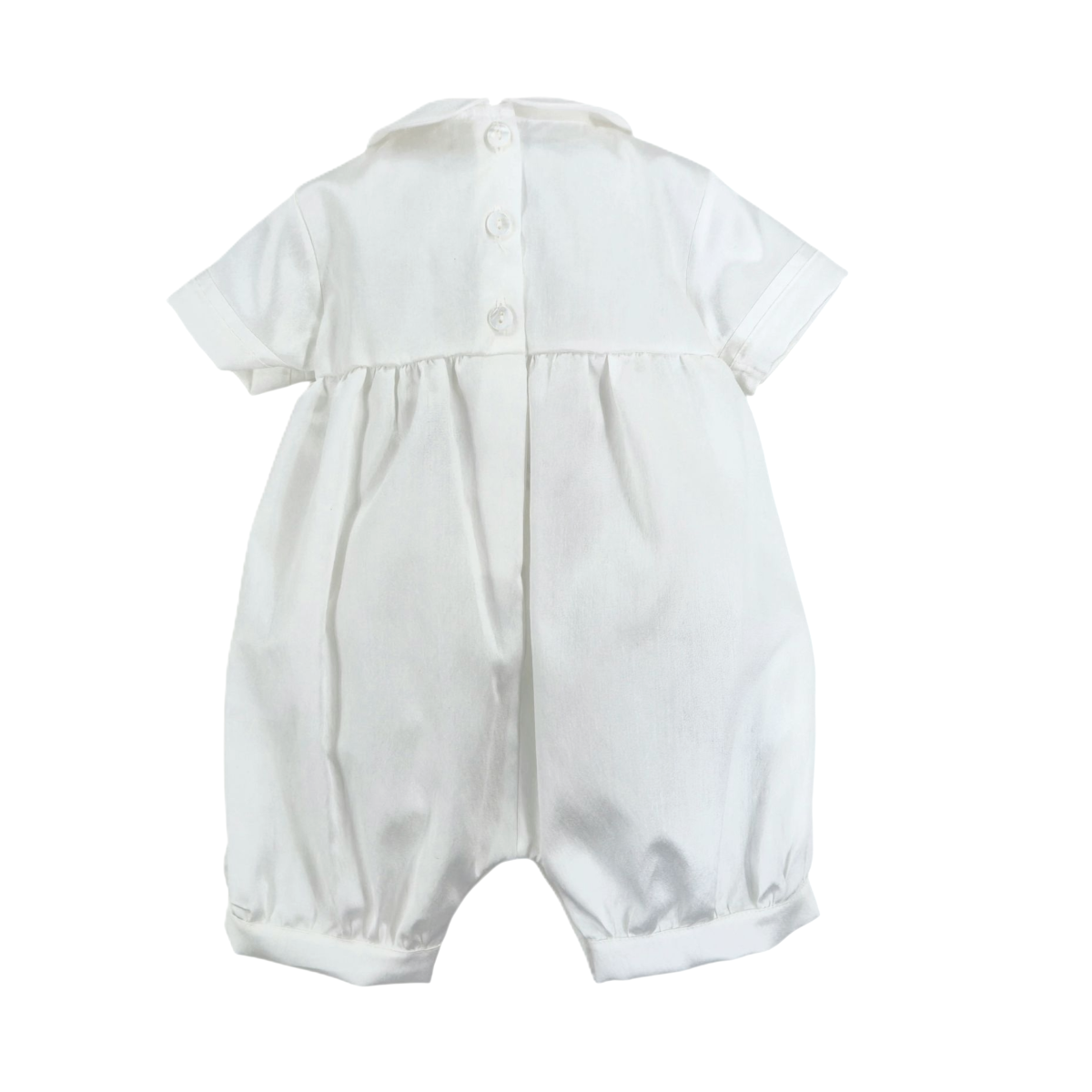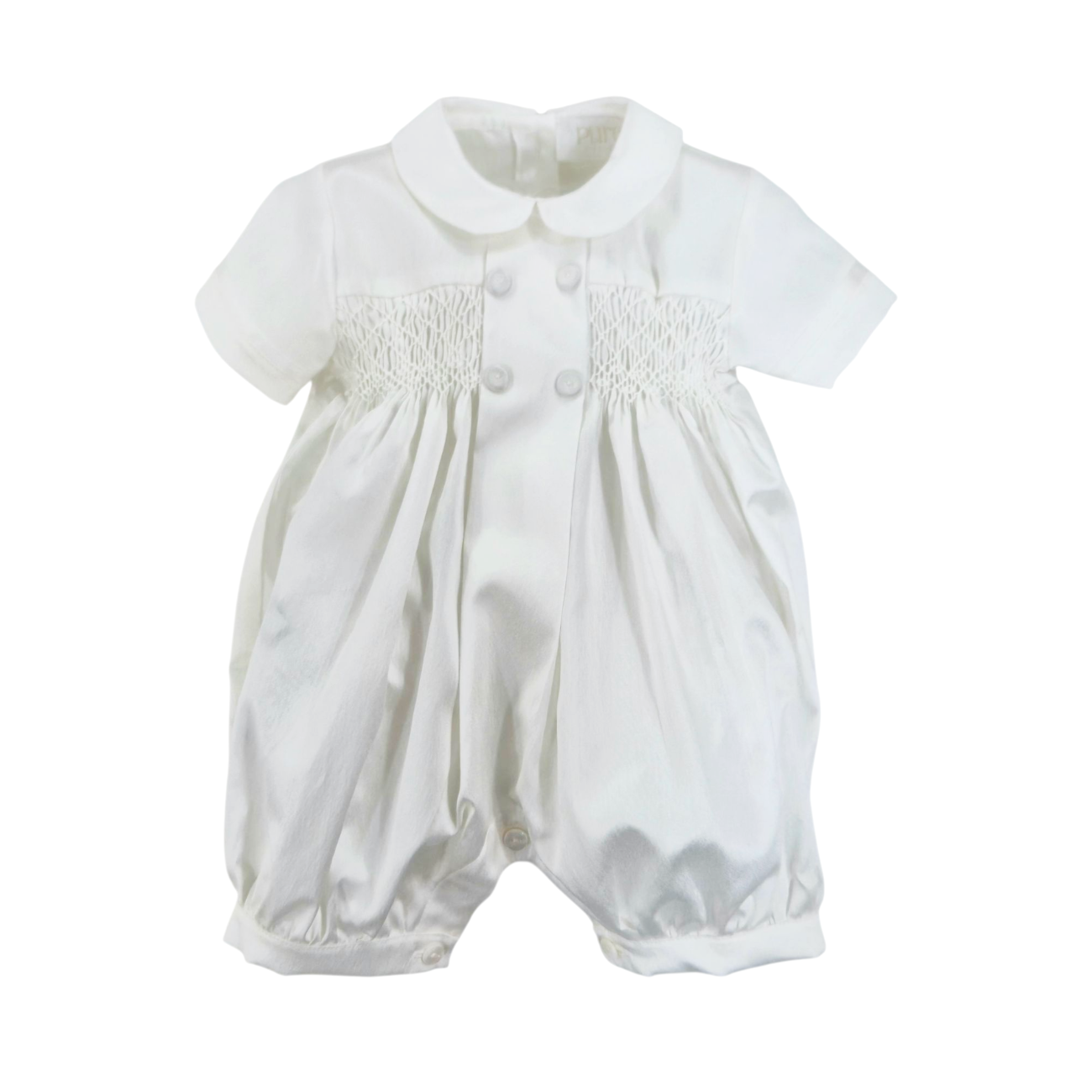 Raffinato pagliaccetto battesimale in taffetà di qualità superiore, completamente realizzato con maestria artigianale. Il delicato ricamo punto smock eseguito a mano sul petto rappresenta un dettaglio di pregio che caratterizza questo capo. Dotato di pratiche chiusure a bottoni posteriori e al cavallo, consente un facile cambio mantenendo l'eleganza. Una scelta consapevole per genitori che desiderano un indumento solenne e ricercato per il momento speciale del Battesimo.