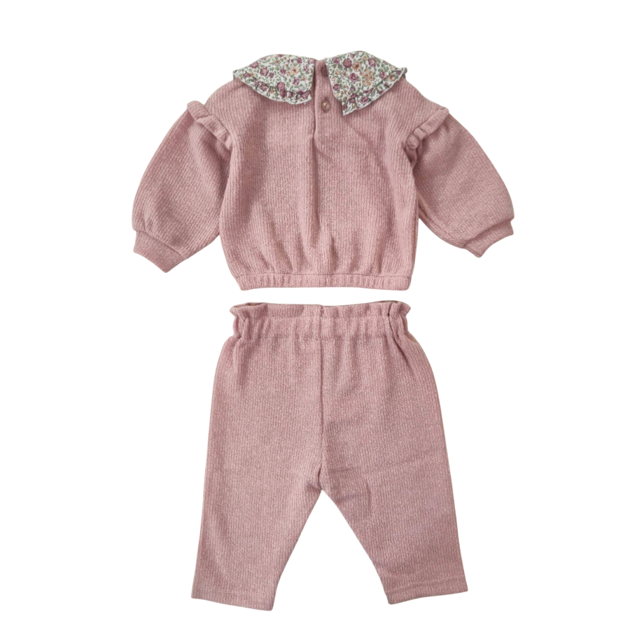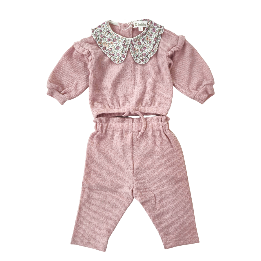 Delicato completo neonata che unisce comfort e stile provenzale. La maglia presenta un coletto ampio con stampa caratteristica e coulisse in vita per una vestibilità regolabile. Il pantalone vita alta con elastico arricciato assicura praticità e libertà di movimento. Perfetto per le giornate di gioco e relax, questo set combina qualità costruttiva e design raffinato, ideale per il guardaroba essenziale della piccola.