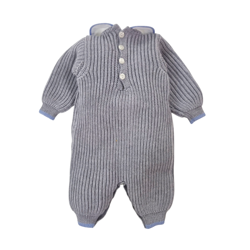 Questa tutina neonato è realizzato in 100% pura lana merino a coste grigio, offrendo morbidezza e calore ideali per la pelle delicata del bambino. Il colletto in piqué bianco, arricchito da un profilo celeste che si ripete sui polsini, aggiunge un elegante contrasto cromatico. Il fiocco azzurro in coste sul davanti conferisce un dettaglio raffinato e distintivo rendendo questa tutina la scelta ideale per la prima uscita clinica, con comfort e stile assicurati.