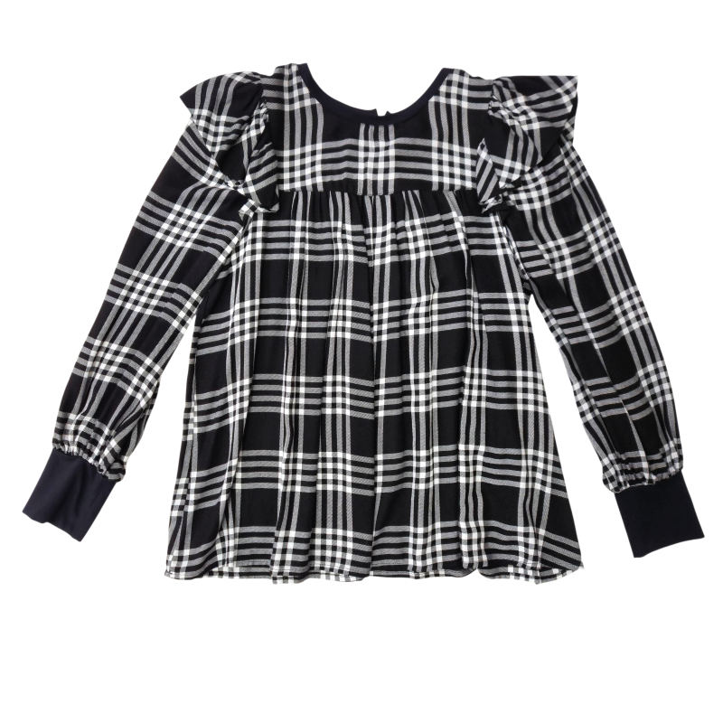 Questa camicia per bambina in tessuto check combina eleganza e comodità con un design svasato che favorisce libertà di movimento. Il girocollo è arricchito da una raffinata galette sulle spalle, mentre le maniche lunghe con polsi in maglina assicurano una vestibilità confortevole e pratica. La chiusura sul retro a goccia con bottone aggiunge un dettaglio delicato e facilita l’indosso. Perfetta per vestire con stile ogni giorno, un capo versatile e di qualità da non perdere.