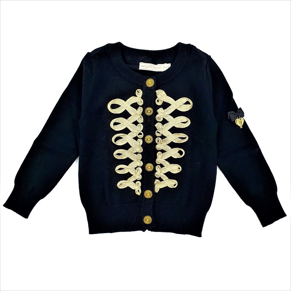 Questo cardigan per bambina unisce eleganza e dolcezza con le sue applicazioni dorate sulla parte frontale, i bottoni coordinati e i profili a costine. Il dettaglio del fiocchetto con cuore dorato sul braccio sinistro, firmato dal brand, aggiunge un tocco raffinato e unico. Perfetto per ogni occasione speciale, assicura comfort e stile in un capo irresistibile.