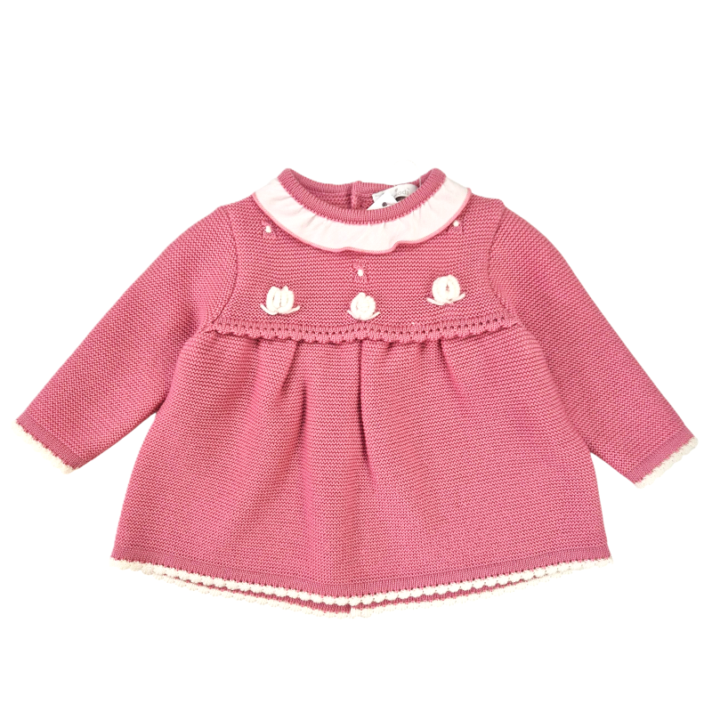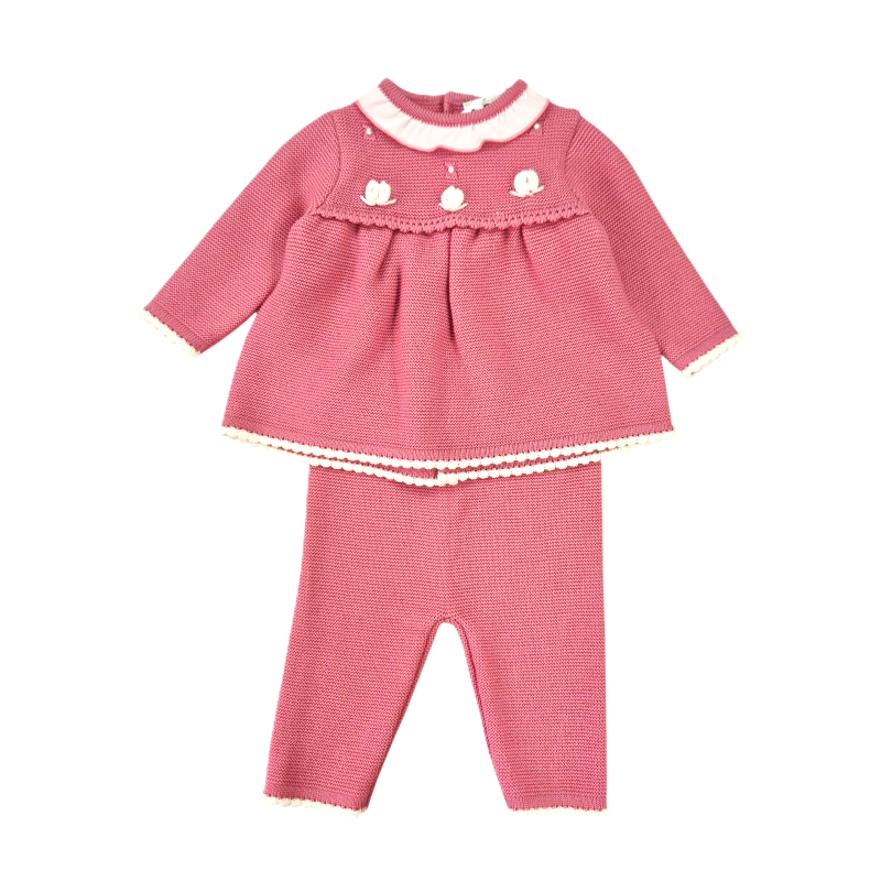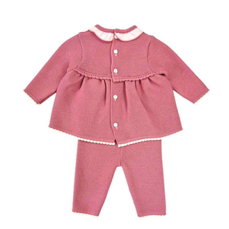 Questo completo per neonata, realizzato in lana merino extrafine, garantisce morbidezza e calore delicato sulla pelle sensibile. La veletta in cotone intorno al collo assicura comfort e traspirabilità, mentre il ricamo a punto vapore sul carrè aggiunge un tocco di eleganza artigianale. La maglia svasata con profilo smerlato e il pantalone con elastico in vita e dettaglio smerlato a contrasto completano un outfit raffinato e pratico, perfetto per la prima uscita clinica della tua piccola. Un abbigliamento che unisce stile e funzionalità per momenti speciali.