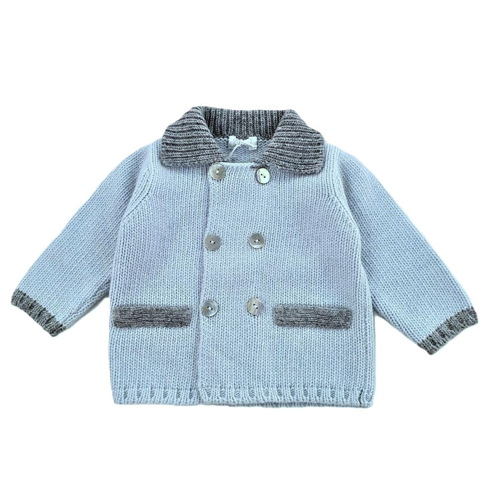 Realizzata in pura lana vergine, questa giacchina doppio petto con colletto e profili a coste in elegante grigio antracite offre calore e morbidezza, perfetta per proteggere il tuo neonato con stile. Ideale come cardigan o cappottino, è una scelta raffinata che unisce comfort e praticità per i primi mesi di vita.