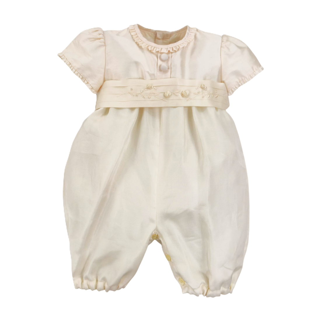 Un pagliaccetto da principino! Confezionato in seta shantung 100% con interno in cotone, questo capolavoro vanta collo e maniche ornati da delicate rouche, bottoni ricoperti sul davanti e una cintura in vita decorata con roselline ricamate a mano. Le chiusure pratiche sul retro e sul cavallo garantiscono comodità durante il cambio. Perfetto per rendere il battesimo del tuo piccolo un momento indimenticabile e straordinariamente elegante.