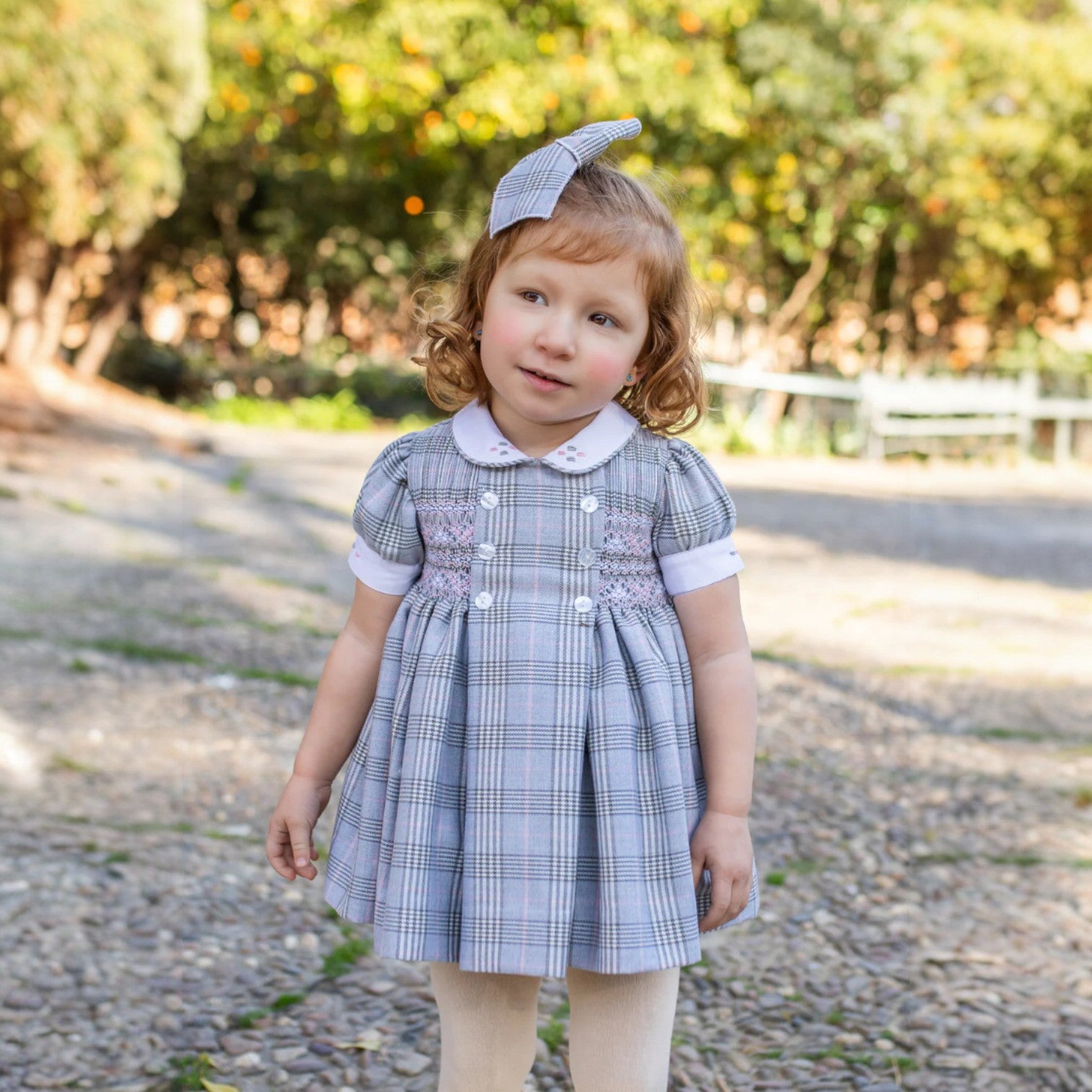 Questo abito per bambine combina un tessuto di flanella a quadri con morbidezza e calore, arricchito da maniche corte a palloncino e un delicato ricamo punto smock rosa a contrasto. Il doppio petto e il colletto ricamato aggiungono un fascino classico, mentre la cintura con fiocco valorizza la figura. La chiusura sul retro con bottoni facilita la vestizione. Realizzato in poliestere e viscosa, è una scelta elegante e confortevole per eventi speciali, perfetto per rendere ogni occasione indimenticabile.