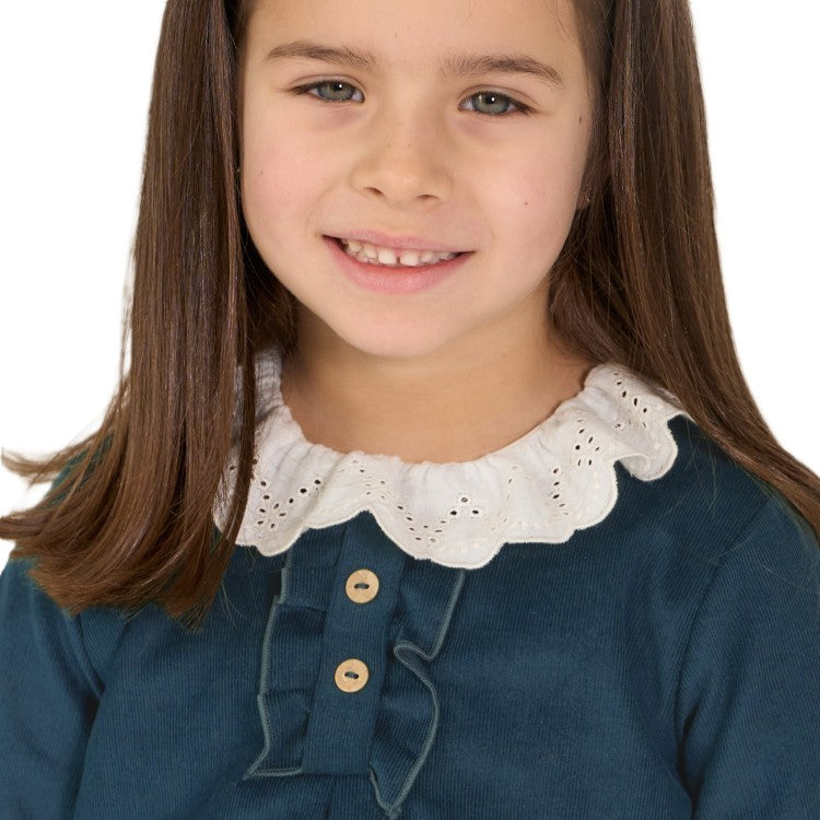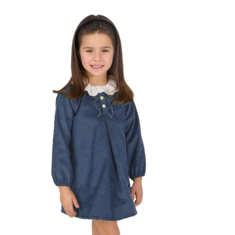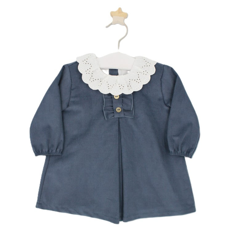 Questo abito per bambine, realizzato in velluto a costine abbinato a delicata batista, unisce stile e comfort. Il colletto smerlato impreziosito da un ricamo raffinato aggiunge un tocco elegante, mentre la manica lunga con elastico ai polsi garantisce una vestibilità pratica e confortevole. La chiusura con clip sul retro rende facile indossarlo, e la fodera interna assicura morbidezza e calore, ideale per ogni occasione speciale. Un capo raffinato pensato per vestire con dolcezza e classe le più piccole.