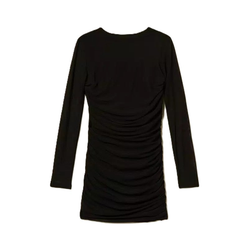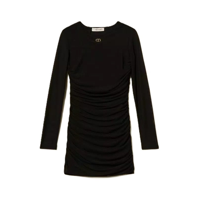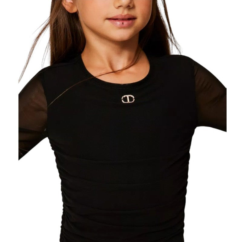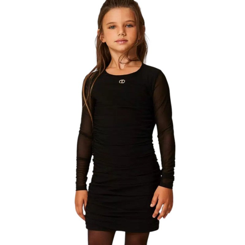 Questo abito corto da bambina in tulle unisce eleganza e comfort grazie alla sua linea fitted e alla morbida fodera in jersey di cotone stretch. Il collo tondo e le maniche lunghe trasparenti esaltano la delicatezza del design, mentre l'arricciatura e il logo Oval T in metallo aggiungono un tocco distintivo e raffinato, perfetto per ogni occasione speciale.