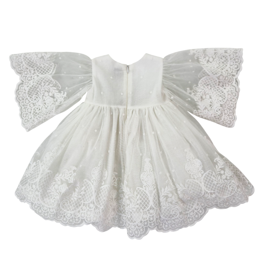 Abito cerimoniale in organza plumetis pregiata, arricchito da ricami raffinati per occasioni indimenticabili come battesimi e celebrazioni familiari. Le maniche ampie e lunghe conferiscono eleganza classica e libertà di movimento. La costruzione accurata prevede sottoveste in poliestere, fodera in cotone e tulle stratificato che dona volume e struttura al capo. Una scelta consapevole per chi ricerca qualità costruttiva e dettagli curati in un abito destinato ai momenti più significativi.