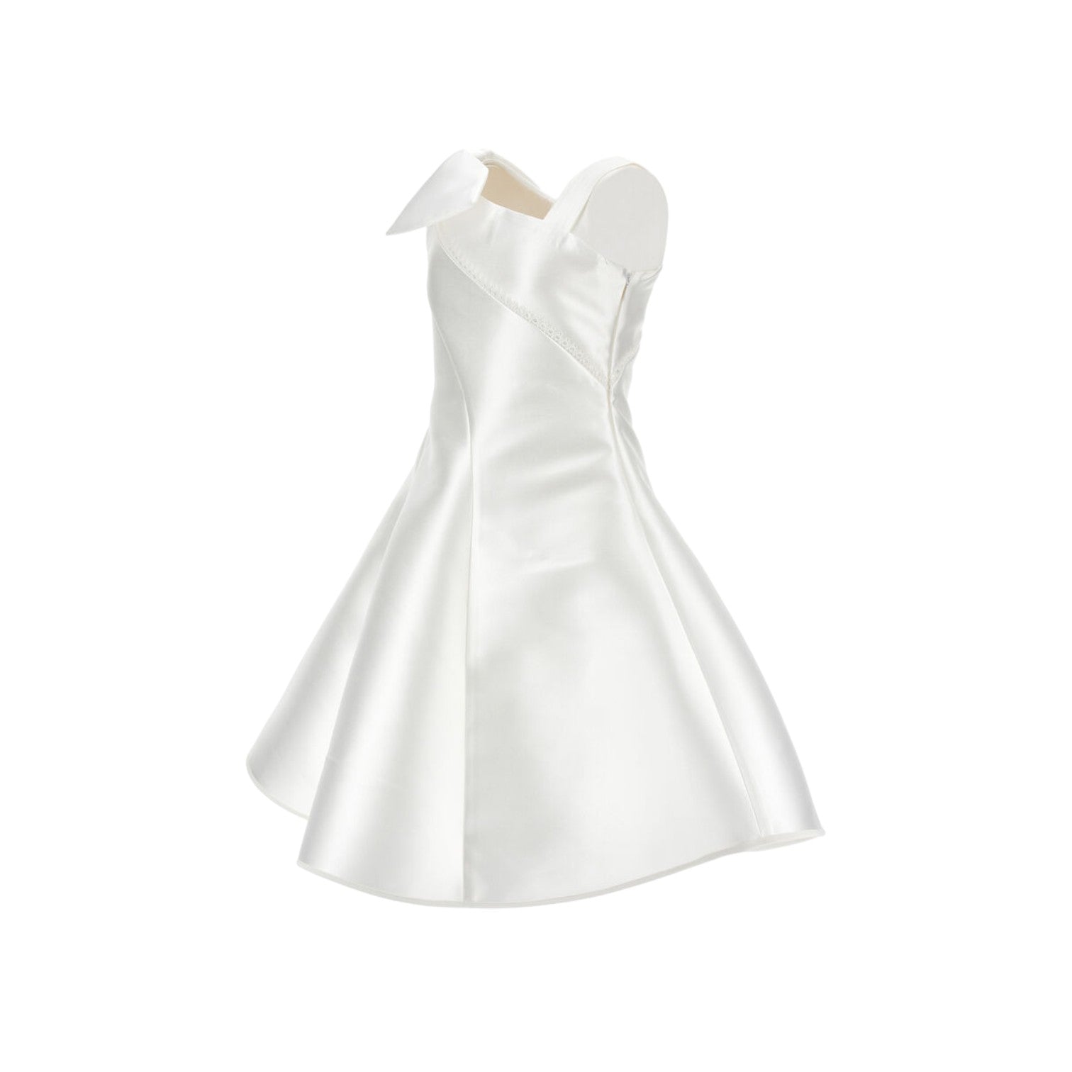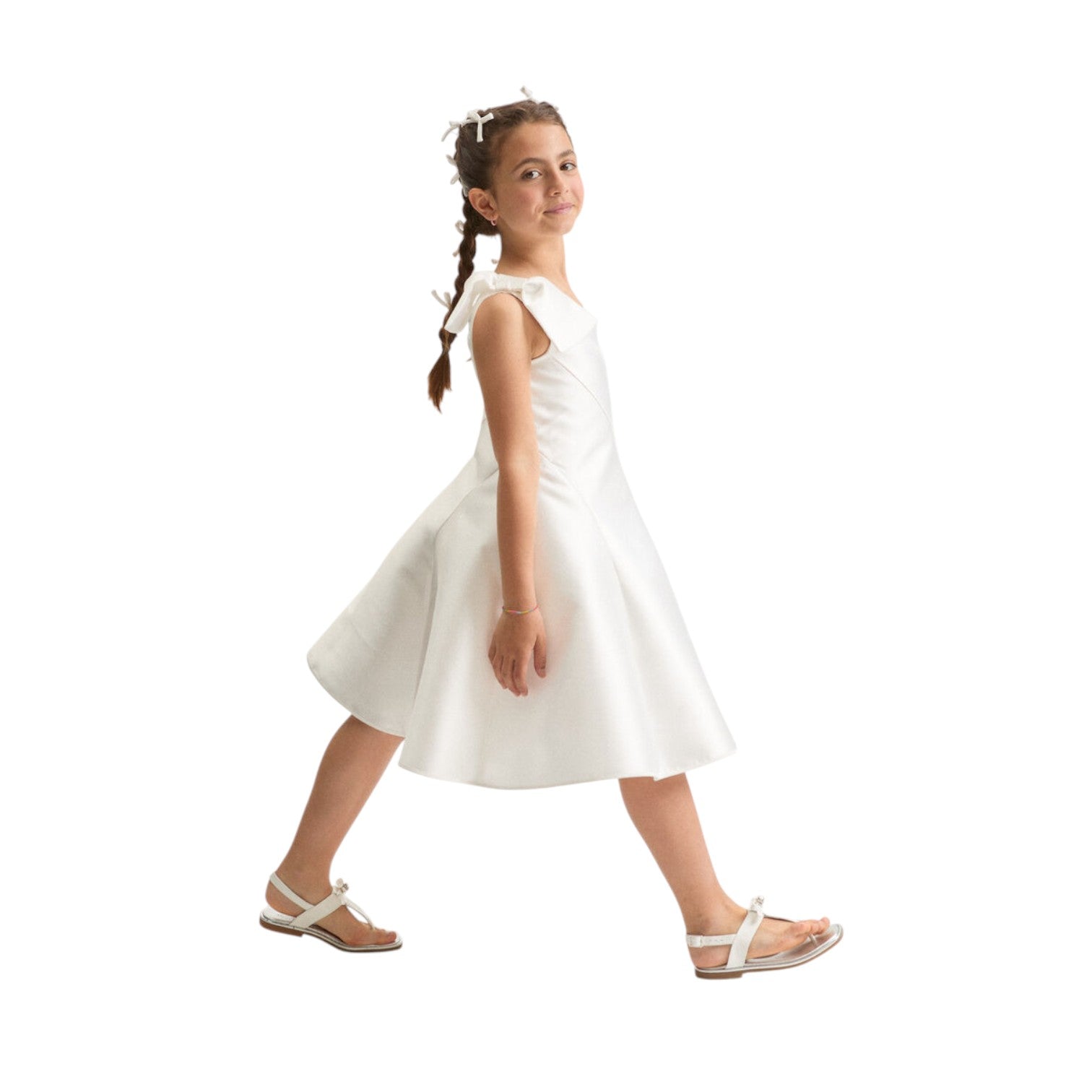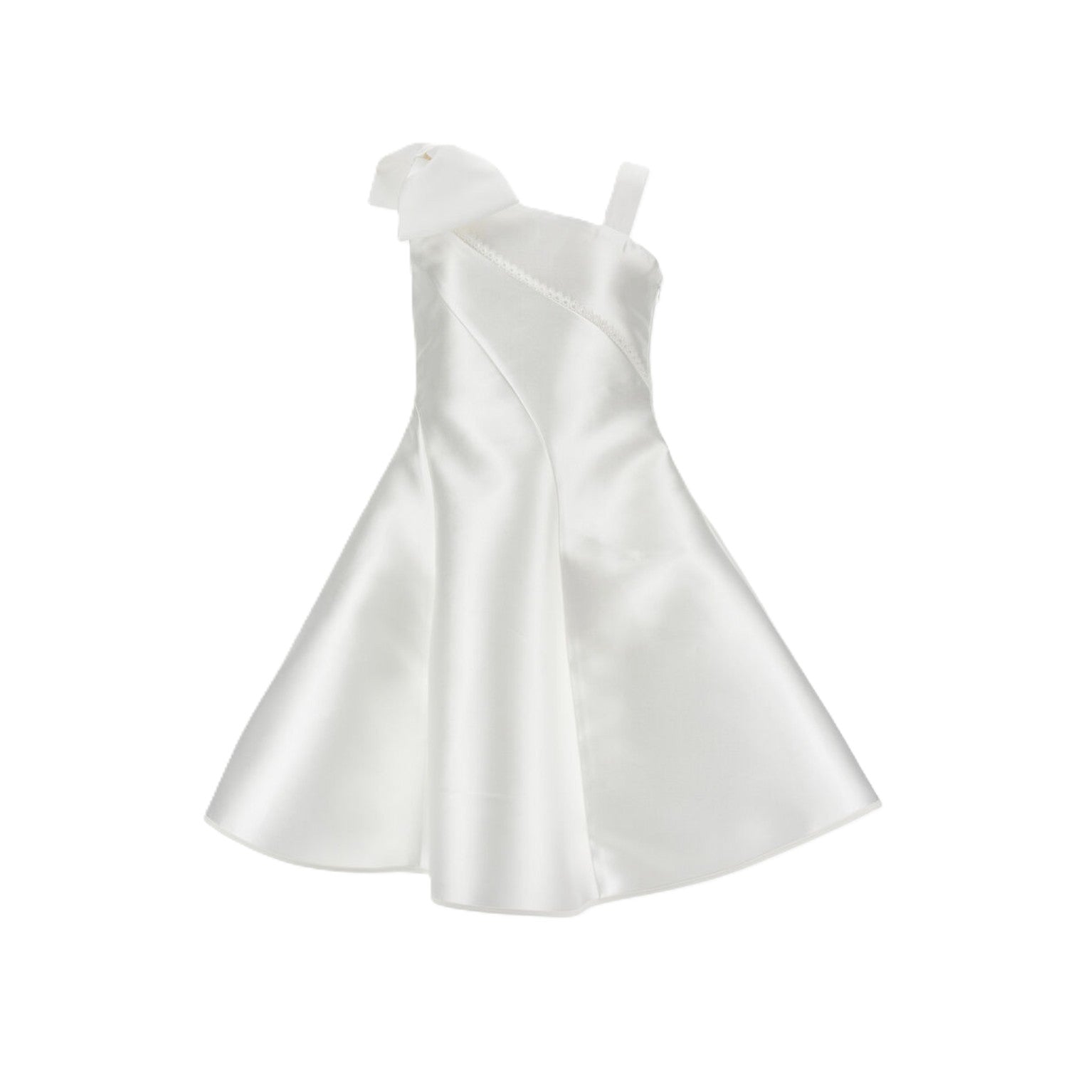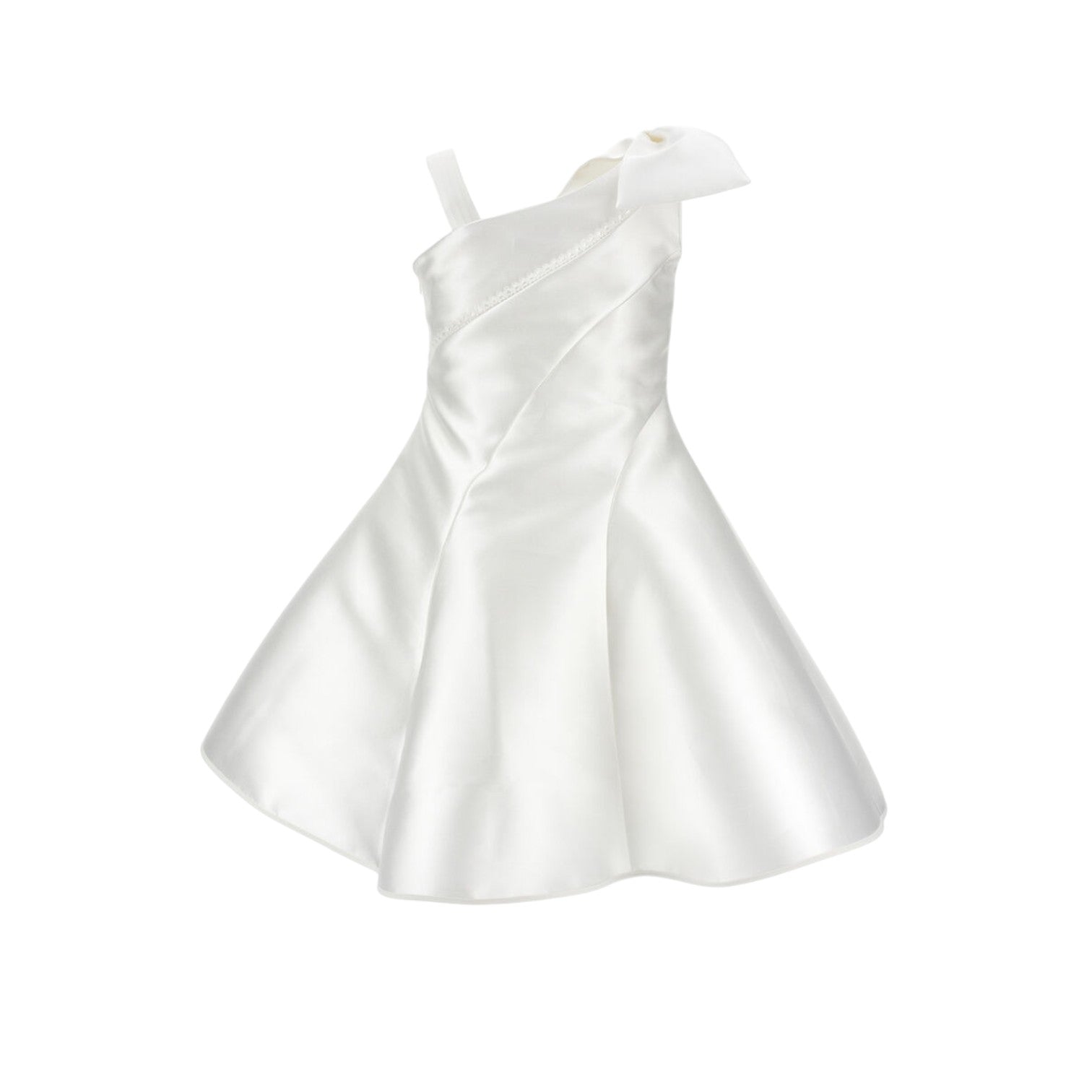 Questo raffinato abito monospalla in mikado è la scelta ideale per le occasioni più importanti della vostra bambina. Il design elegante presenta un delicato fiocco decorativo posizionato sulla spalla, mentre il tessuto lucido garantisce un'estetica sofisticata e luminosa. La gonna ampia consente libertà di movimento, perfetta per ballare e divertirsi durante cerimonie e celebrazioni. La chiusura laterale con zip nascosta assicura una vestibilità impeccabile e un finish raffinato. Un capo versatile che trasforma ogni evento speciale in un momento indimenticabile.