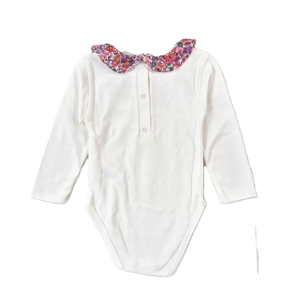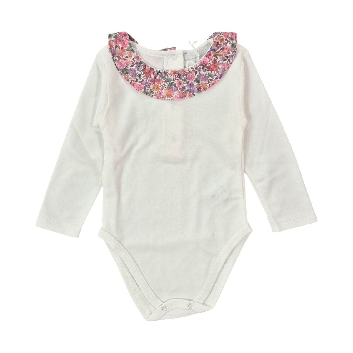 Questo body camicia per neonata, realizzato in puro cotone jersey, garantisce morbidezza e comfort delicato sulla pelle sensibile. Con manica lunga e un raffinato colletto fantasia bouquet di fiori, unisce stile e praticità, perfetto da abbinare a salopette, pantaloni o gonne per un look impeccabile e versatile fin dai primi mesi.