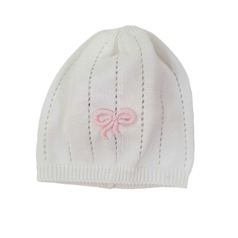 Cappellino per bebè di "Bebè di Almy" in elegante filo di cotone, con delicato ricamo a mano a forma di fiocchetto. La tramatura traforata migliora la traspirazione, mentre il profilo a costine conferisce maggiore resistenza. Regala al tuo bebè il massimo comfort e stile.