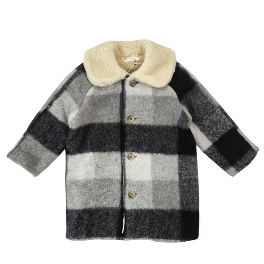 Questo cappotto bimba a quadri unisce calore e stile grazie alla pregiata composizione in 80% lana vergine e 20% poliestere. Il design parka lungo con fantasie a quadri in diverse tonalità di grigio conferisce eleganza e versatilità. La fodera interna in soffice lana orsetto assicura un comfort avvolgente anche nelle giornate più fredde, mantenendo la tua bambina al caldo senza rinunciare alla praticità. Perfetto per affrontare l’inverno con un tocco di classe.