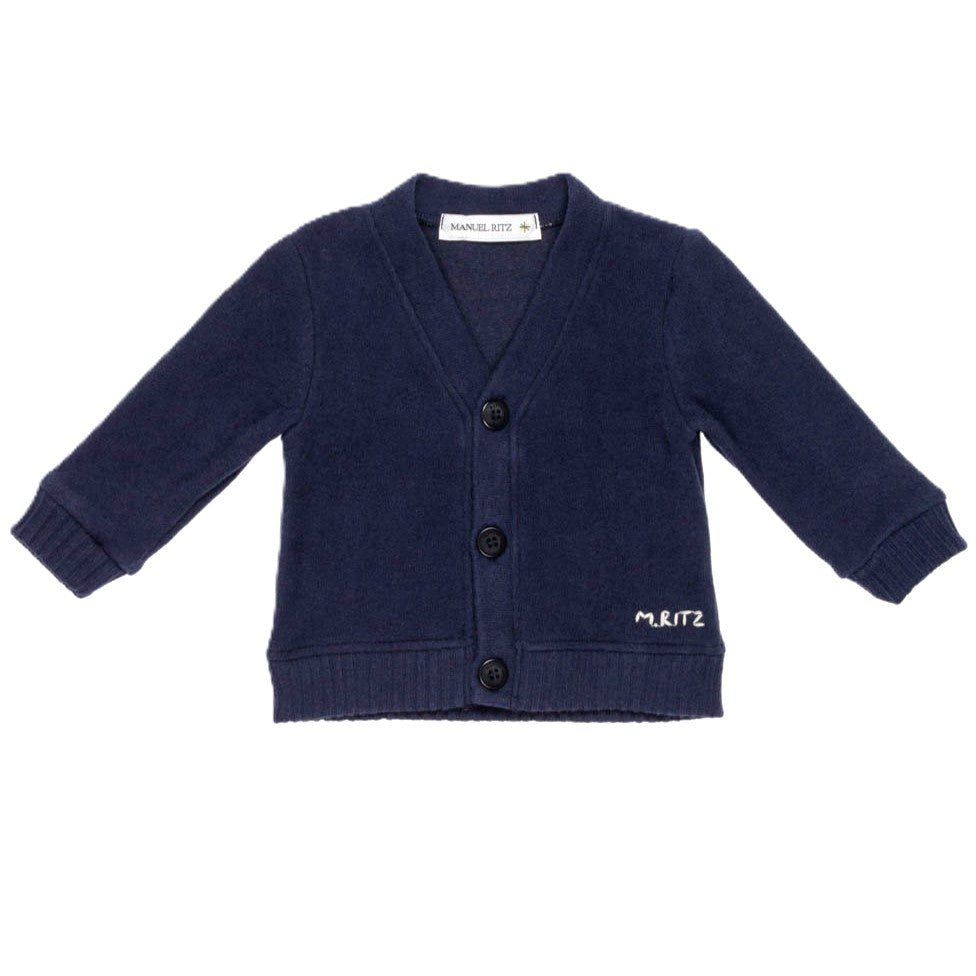 Questo cardigan felpa baby blu unisce stile e comfort grazie ai bottoni sul davanti e ai dettagli a coste coordinati su polsi e vita. Realizzato in cotone e lana sintetica, offre calore morbido e una vestibilità perfetta. La scritta "Manuel Ritz" bianca sul lato sinistro aggiunge un tocco distintivo e moderno, rendendolo ideale per i piccoli con buon gusto.