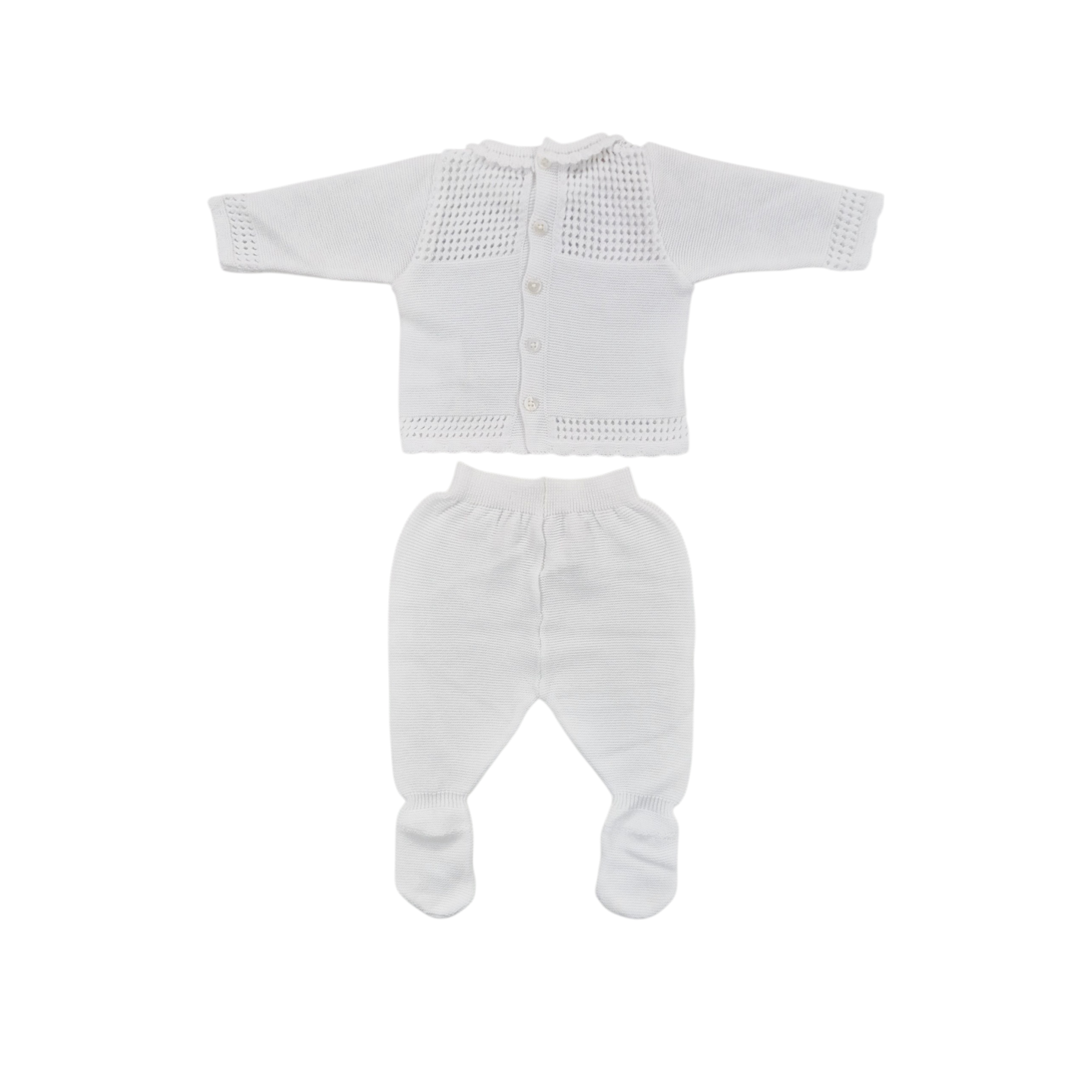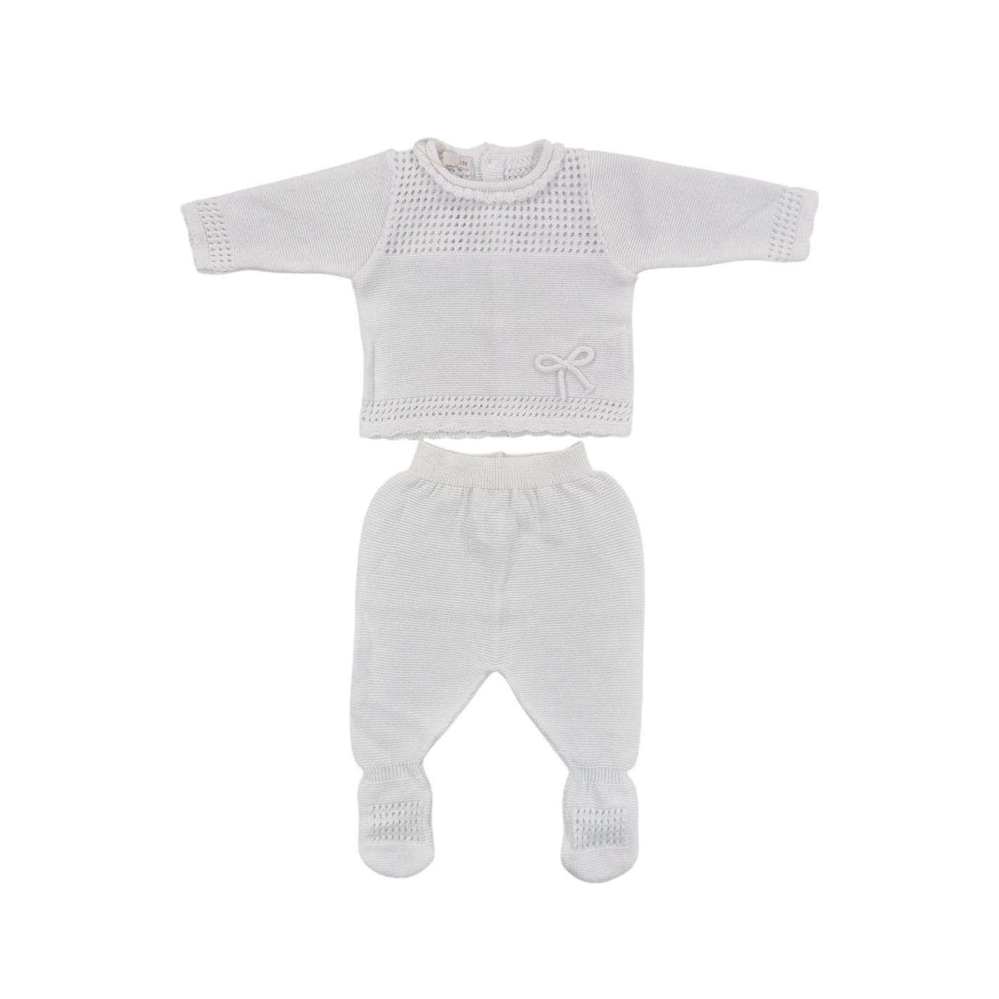 Delicato completo in puro filo di cotone, perfetto per neonati e neonate. La maglia presenta eleganti dettagli traforati sul petto, davanti e dietro, oltre che sul fondo e sui polsi, con un raffinato fiocchetto sul lato sinistro. Il pantalone è dotato di elastico in vita e profilo a costine, con trafori decorativi sui piedi. Un capo versatile e traspirante, ideale per le stagioni calde, che unisce praticità e stile delicato per i più piccoli.