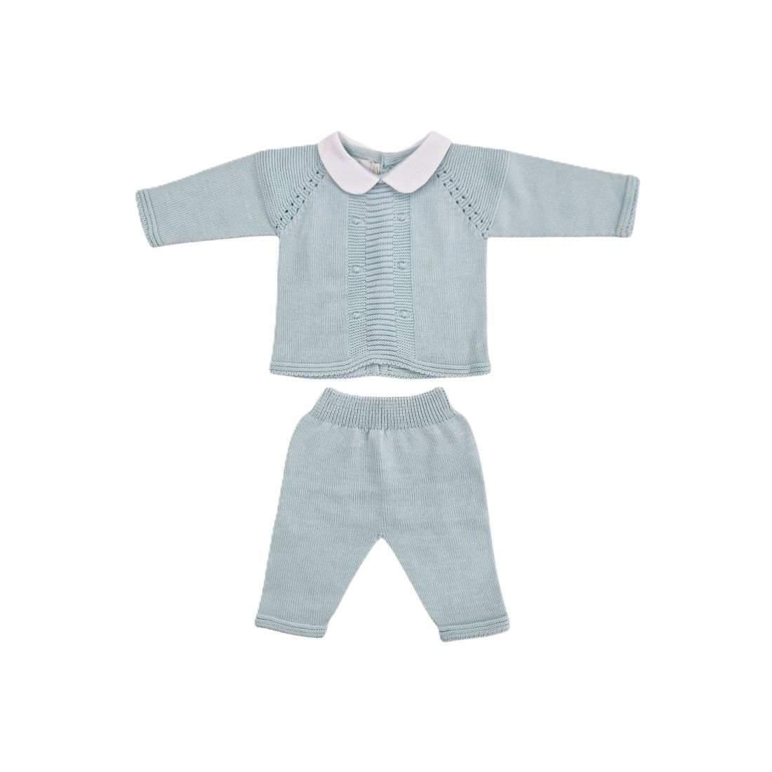 Elegante completo in puro filo di cotone, perfetto per le occasioni speciali. La maglia presenta un raffinato colletto bianco in cotone piquet, dettagli traforati sulle spalle e un delicato motivo a pois in rilievo tono su tono sul davanti. Il pantalone, comodo e pratico, è dotato di elastico in vita e profili a costine per una vestibilità ottimale. Un capo versatile che unisce stile e comfort per il vostro bambino.