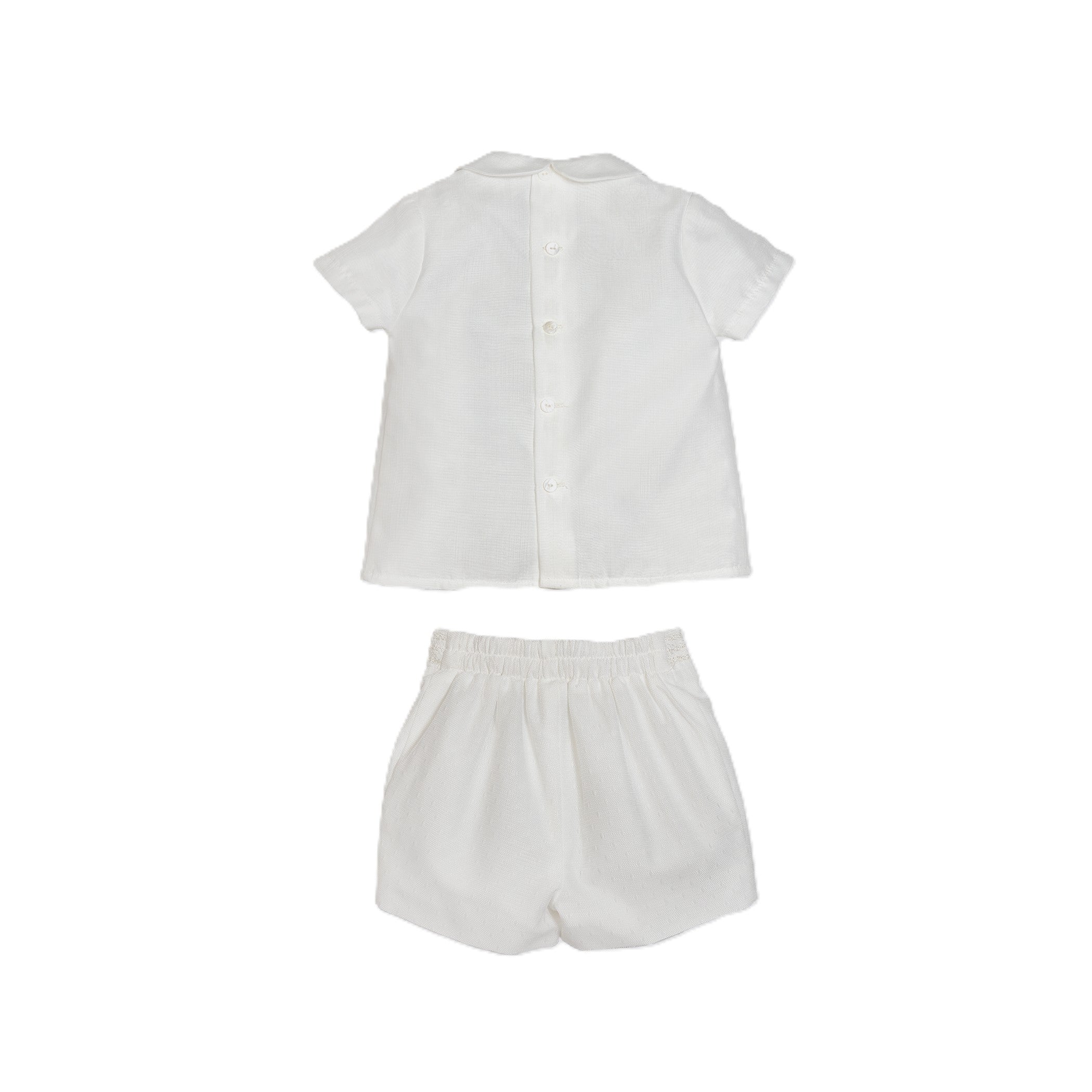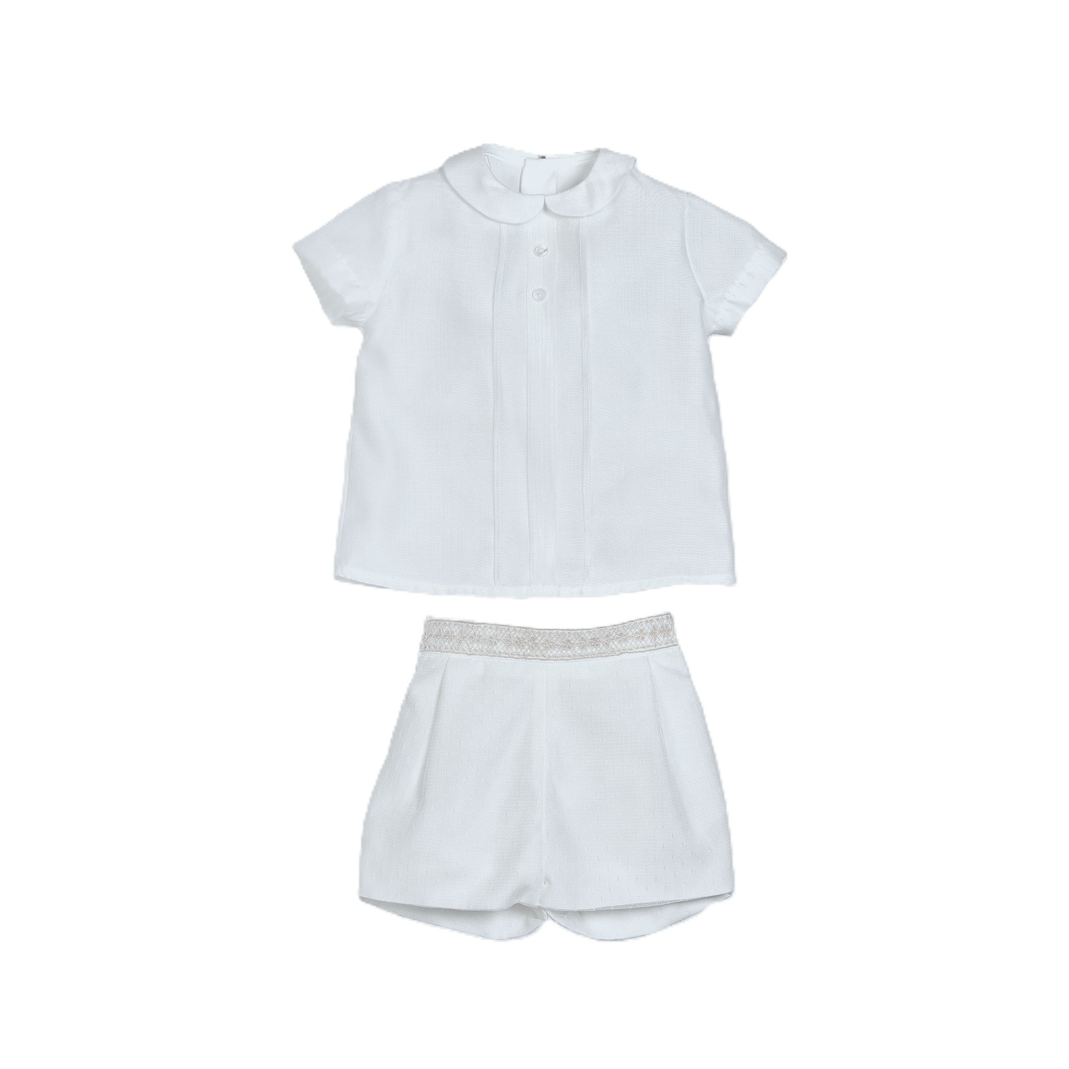 Completo da bambino in due pezzi. Composto da camicia maniche corte con colletto alla Peter Pan, è impreziosita da due bottoni e da una patta plissettata sul petto rendendola elegante per un evento speciale. E realizzata in organza grezza e foderata in cotone popeline per evitare trasparenze. Chiusura sul retro con bottoni. I pantaloni presentano un bellissimo bordo in pizzo sul cinturino vita. Sono realizzati in tulle plumetis con elastico sul retro. Perfetto per rendere speciale un giorno indimenticabile.