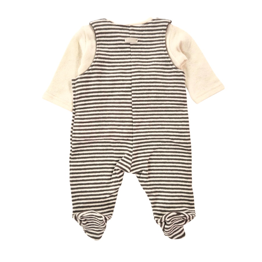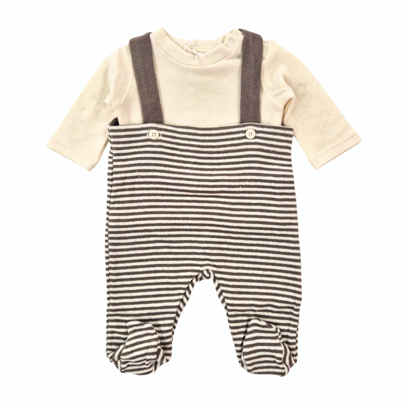 Questo completo neonato unisce una t-shirt in morbido cotone e acrilico color panna e una salopette a righe verde kiwi e panna, entrambi realizzati con materiali caldi e confortevoli. Ideale per mantenere il tuo bambino avvolto in dolcezza e stile durante le giornate più fresche, garantendo comfort e libertà di movimento. Un capo pratico e raffinato per i primi mesi di vita.