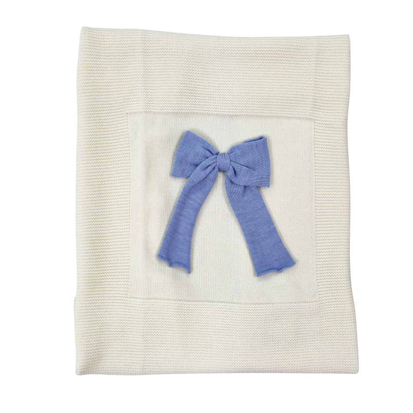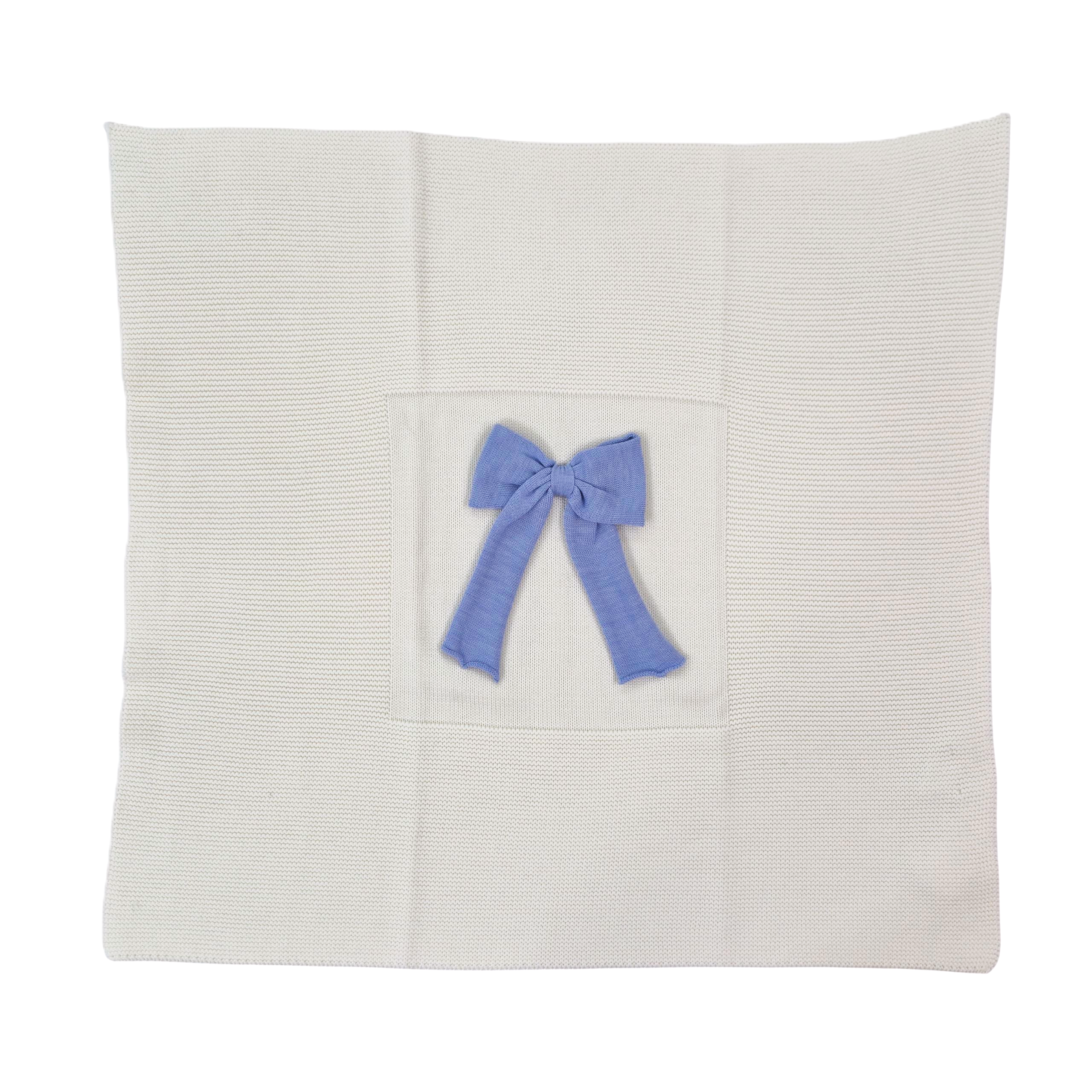 Questa copertina in pura lana merino extrafine misura 85x85 cm ed è arricchita da un elegante fiocco over centrale in celeste, con bordi alti dalla raffinata trama a grana di riso. Perfetta per la prima uscita dalla clinica, unisce morbidezza e stile, donando al tuo piccolo una coccola calda e un tocco di classe indimenticabile, soprattutto se abbinata al coordinato dedicato.