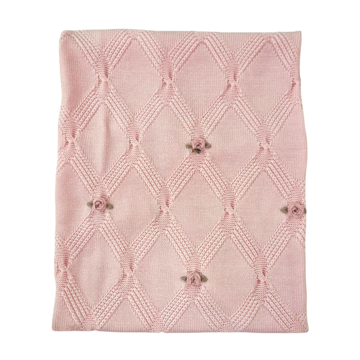 Realizzata in pura lana merino extrafine, questa copertina unisce morbidezza e calore ideale per i momenti più preziosi. Il design a rombi si arricchisce di delicate roselline ricamate a mano con punto vapore nel raffinato colore marsala, donando un tocco di eleganza artigianale. Perfetta per coccolare con stile chi ami di più.