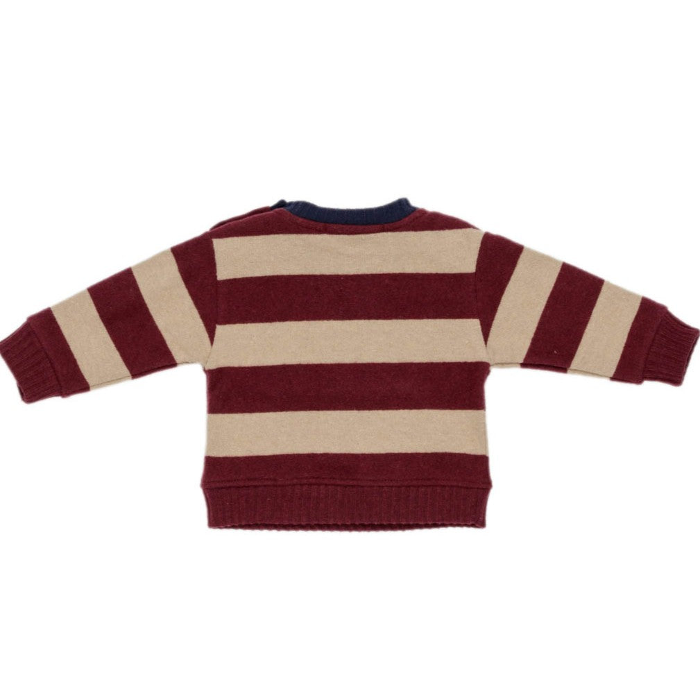 Questa felpa maglia girocollo baby unisce stile e comodità con un elegante motivo a strisce amarone e beige sia sul davanti che sul retro. I dettagli  a coste blu al collo e bordeaux su polsi e vita donano un tocco distintivo. Realizzata in un caldo mix di cotone e lana, assicura comfort e protezione nei giorni freschi. La pratica ampia tasca frontale rende questa felpa perfetta per i più piccoli, offrendo sia funzionalità che un design raffinato.