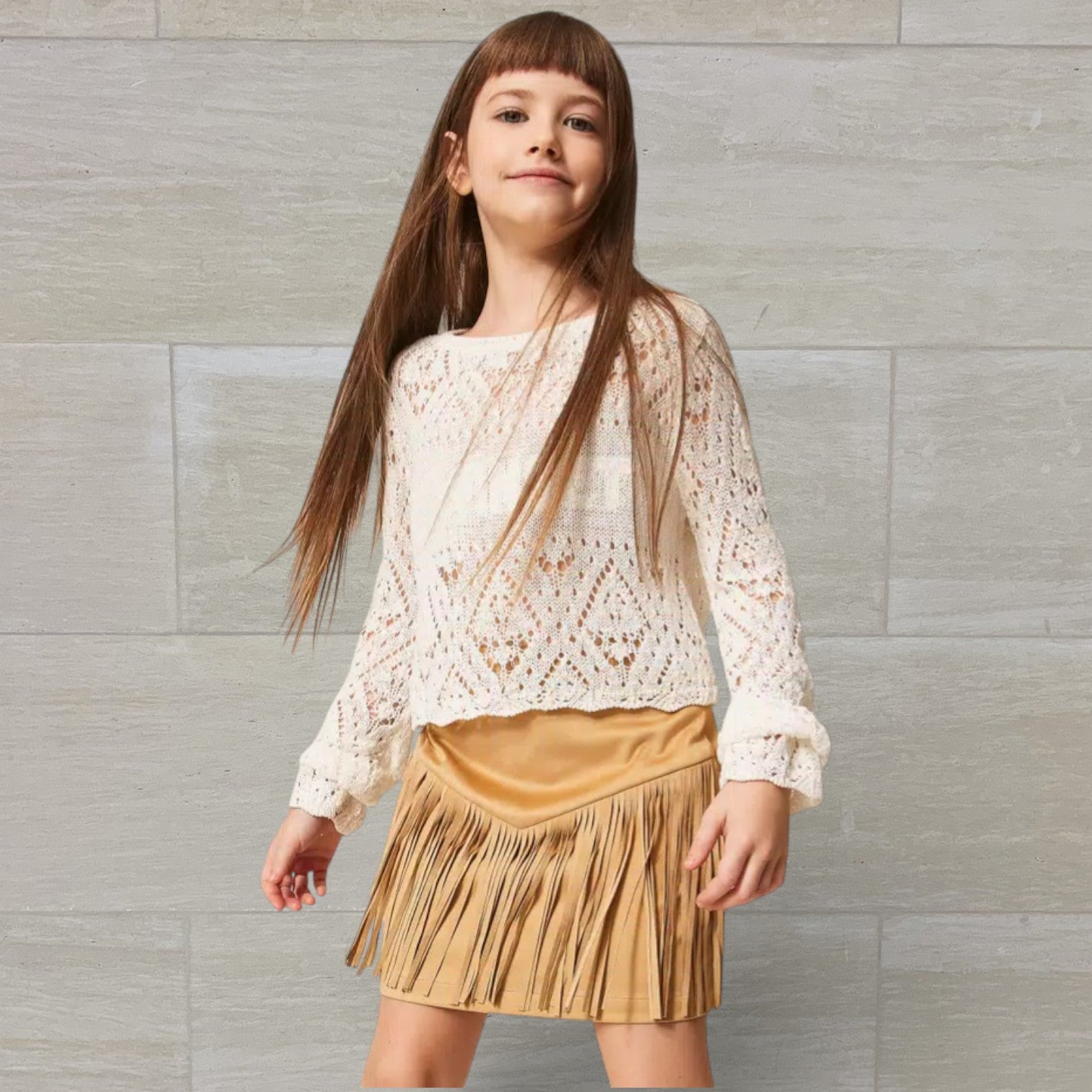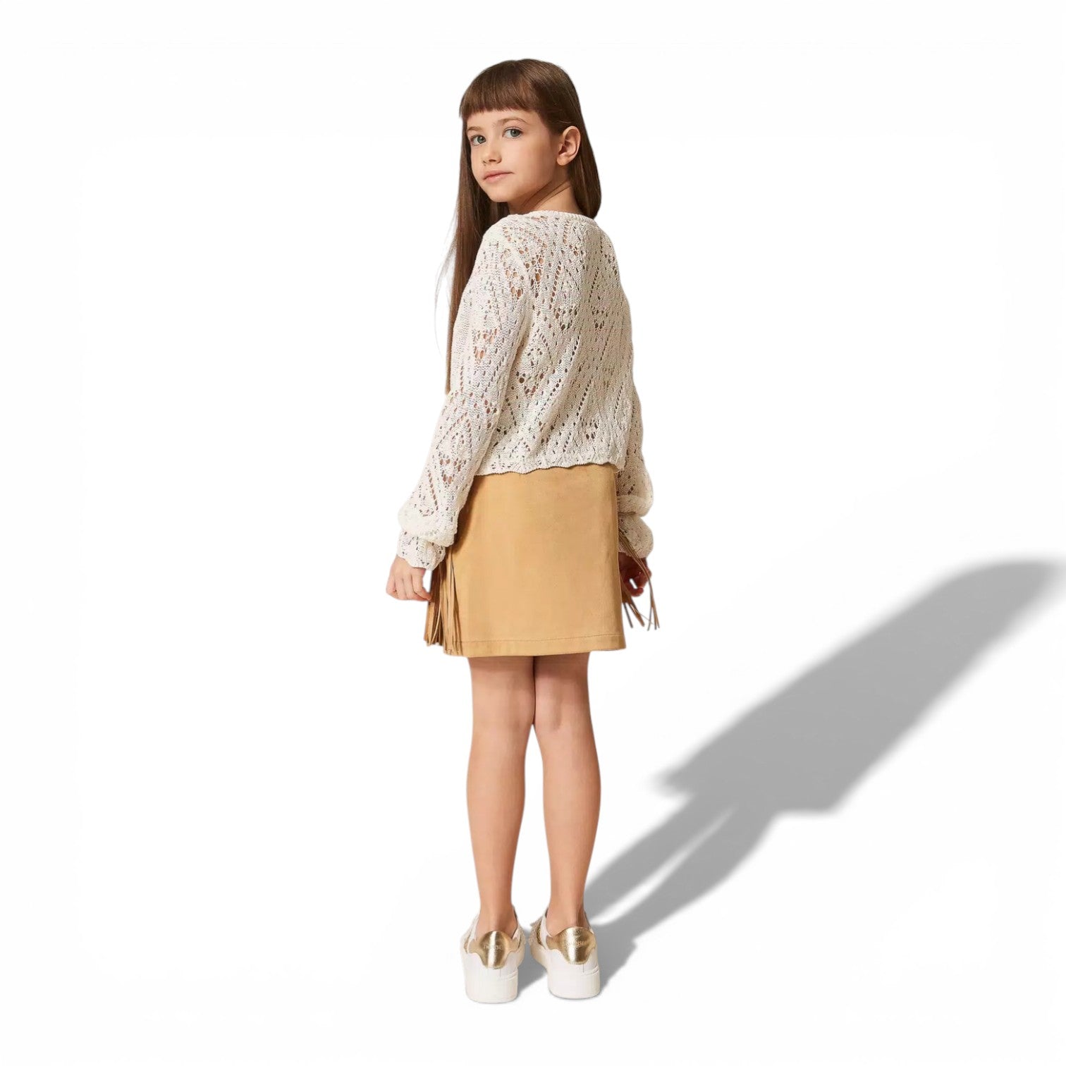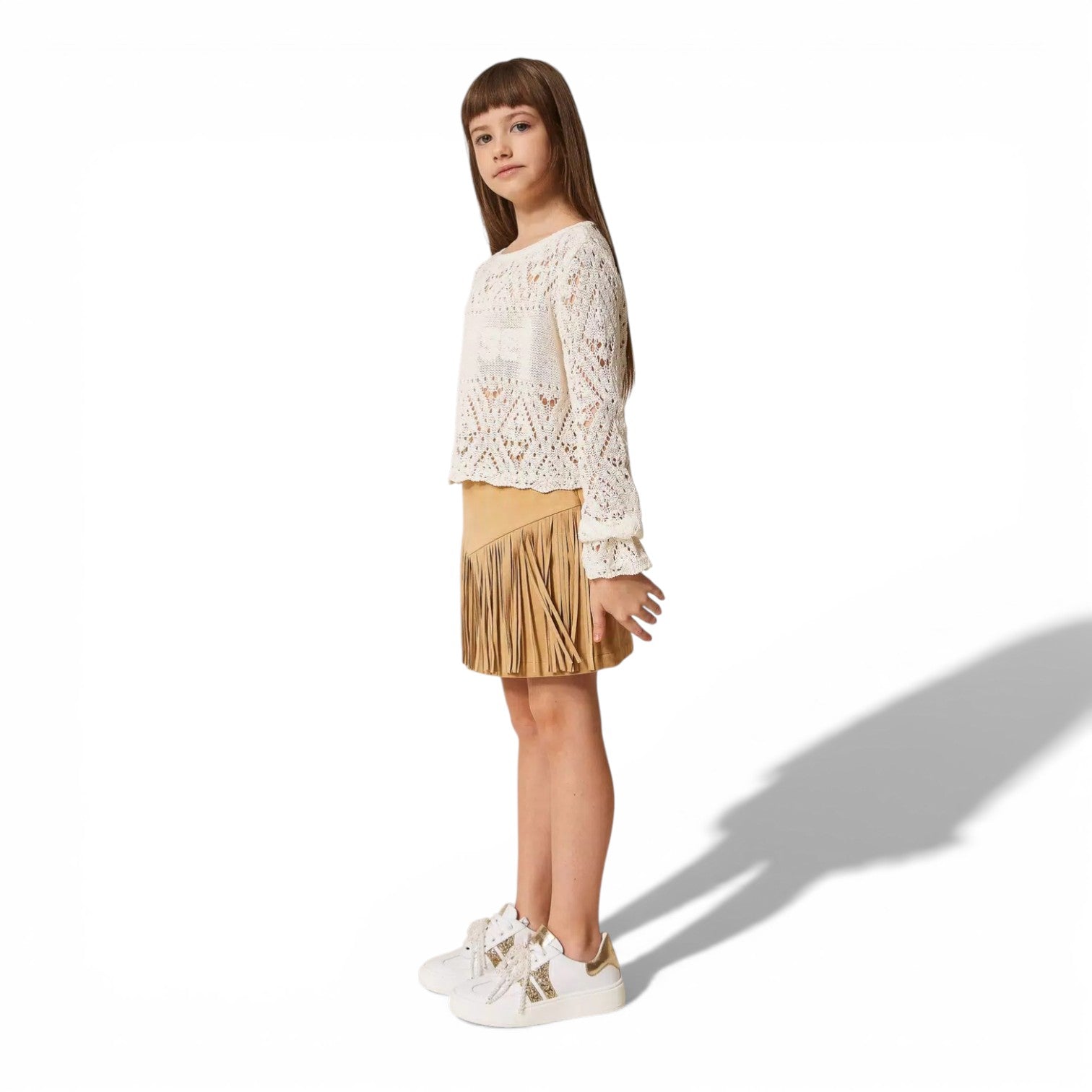 Gonna corta in tessuto effetto scamosciato che cattura lo spirito avventuriero! Dettagli in frange rifiniscono il taglio baschina con stile bohemien, mentre la zip invisibile al fianco garantisce praticità. La fodera interna assicura comfort durante il gioco, e la linea dritta offre libertà di movimento. Colore beige "Safari" perfetto per look versatili. Composizione: 93% poliestere, 7% elastan per morbidezza e elasticità. Ideale per bambine che amano esplorare con stile!