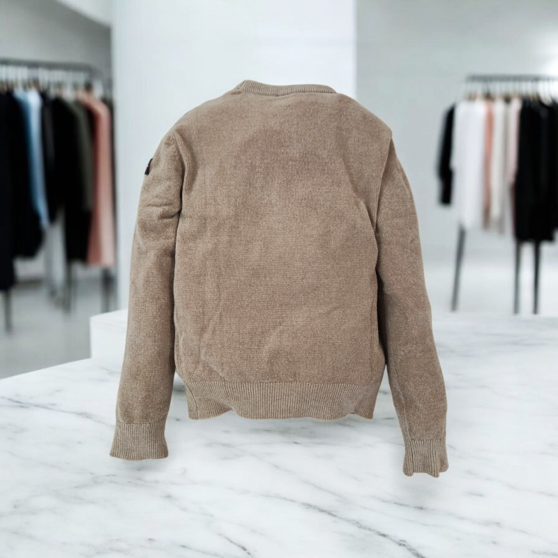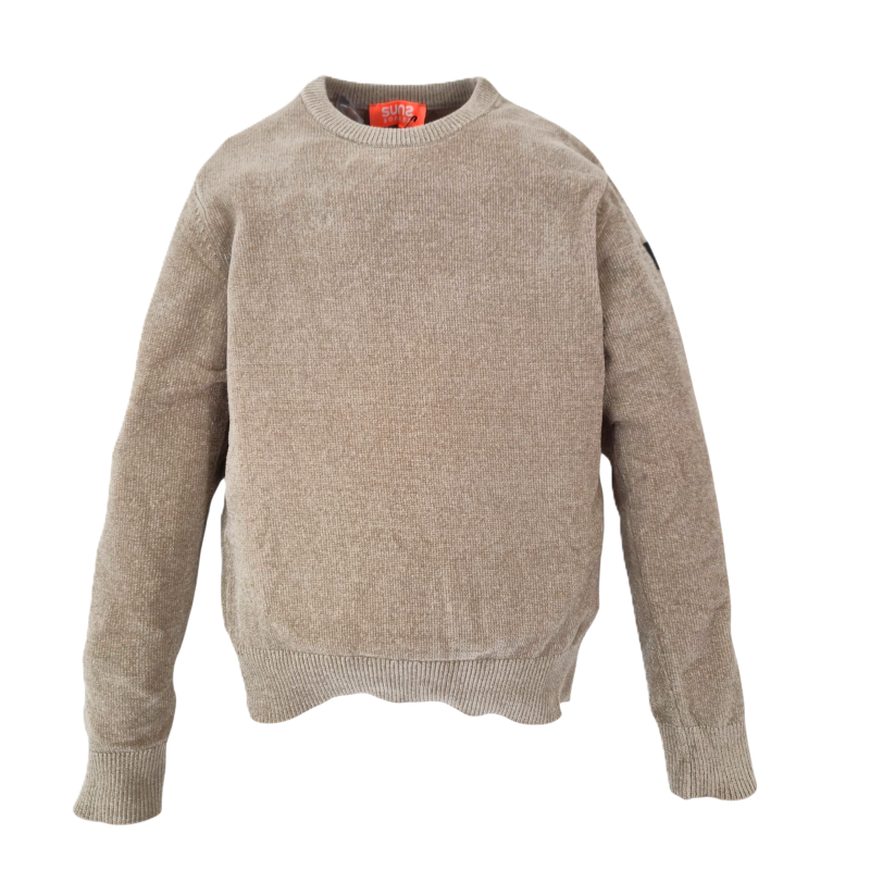Una maglia da bambino in filato effetto ciniglia, ideale per affrontare i mesi più freddi con stile. Il tessuto a lavorazione fine garantisce una piacevole sensazione di morbidezza al tatto, mentre la struttura lineare e il taglio essenziale si adattano perfettamente a diversi look, dal casual al più raffinato. Il collo a coste aggiunge un tocco contemporaneo e funzionale, completato da polsini e fondo a costine per una migliore vestibilità. Un patch Suns è applicato sulla manica sinistra, segno distintivo del brand.