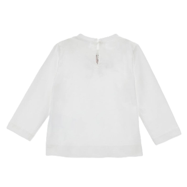 Realizzata in morbido cotone jersey, questa maglia t-shirt con maniche lunghe è caratterizzata da un raffinato fiocco sul colletto e delicati dettagli a stampa cuori. Il design pratico e confortevole la rende perfetta per l’uso quotidiano, mentre la chiusura a goccia con bottone sul retro aggiunge un tocco di eleganza funzionale. Ideale per vestire la tua bambina con stile in occasioni casual e semi formali, unendo comodità e charme in un unico capo.