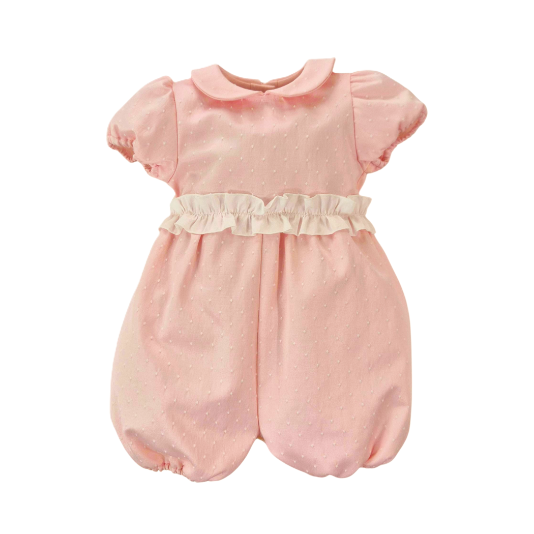 Realizzato in pregiato tessuto mikado plumetis, questo pagliaccetto per neonata unisce eleganza e comfort. Le maniche a sbuffo con elastico donano un tocco delicato, mentre la ruches bianca in vita e la cintura a fiocco sul retro esaltano la raffinatezza del capo. La chiusura con bottoni sul retro e sul cavallo garantisce praticità. Perfetto per eventi speciali, questo pagliaccetto è la scelta ideale per vestire la tua piccola con stile e classe.