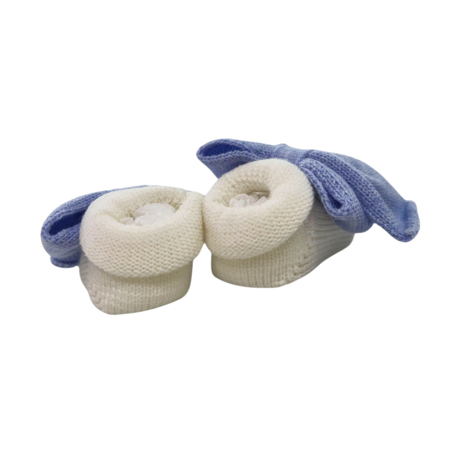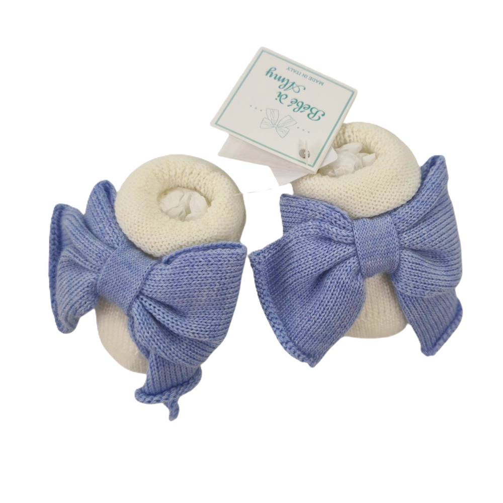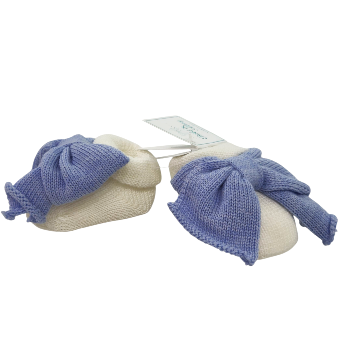 Realizzate in pregiata lana merino extrafine, queste scarpette offrono morbidezza e calore delicato per i piedini dei neonati. La trama in grana di riso unita al fiocco celeste all over sul davanti crea un design elegante e raffinato, perfetto come prima uscita dalla clinica o per eventi speciali. Abbinale al coordinato per un look completo e curato, garantendo comfort e stile in ogni occasione importante.