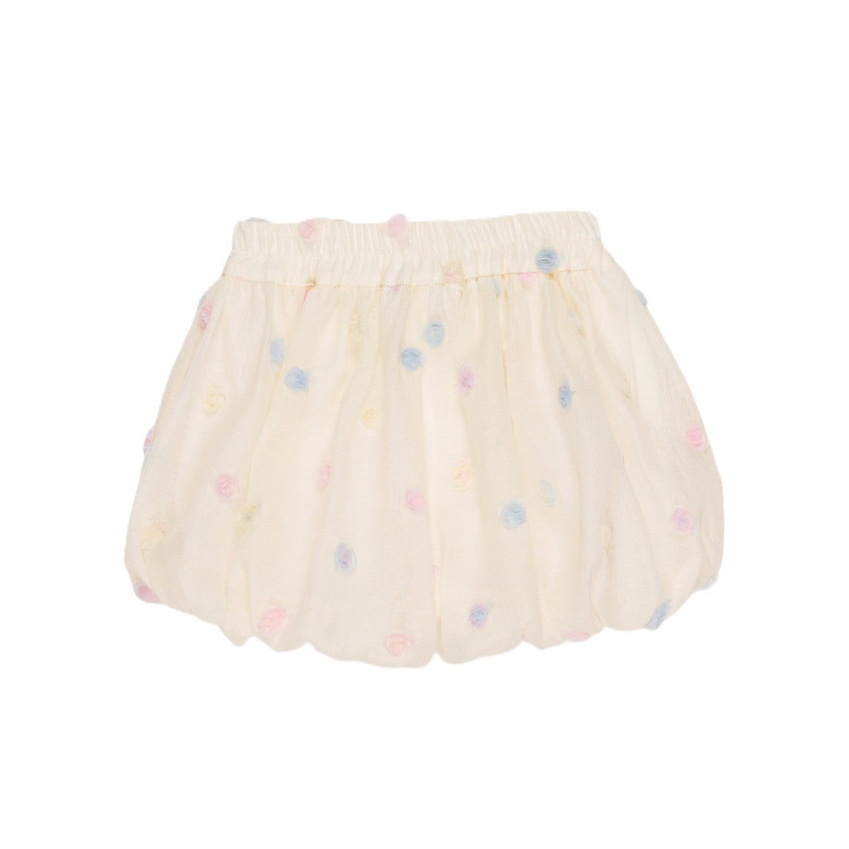 Shorts in organza per bambina, realizzato con cura artigianale e attenzione ai dettagli. L'elastico in vita arricciato assicura una calzata ergonomica e confortevole, mentre il fiocco frontale aggiunge un elemento decorativo elegante. Il ricamo floreale—con rose nei toni del rosa, celeste e giallo—abbellisce uniformemente tutta la superficie del capo, creando un motivo delicato e raffinato. La fodera completa protegge la pelle sensibile della bambina, garantendo morbidezza e traspirabilità. Un capo versatile ideale per occasioni speciali o per il guardaroba estivo, combinando estetica e funzionalità.