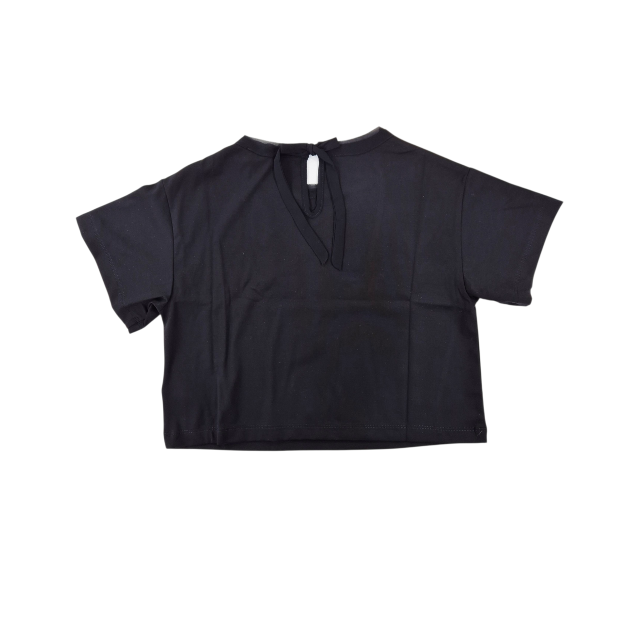T-shirt bimba in morbido interlock light con un tocco di eleganza! Modello cropped che segue le tendenze, impreziosito da un'applicazione in organza delicata sul girocollo. Sul davanti, il logo scritto brilla di strass scintillanti per un effetto glamour. La chiusura posteriore a goccia con fettucce in organza aggiunge un dettaglio romantico e sofisticato. Perfetta per le piccole fashioniste che amano brillare!
