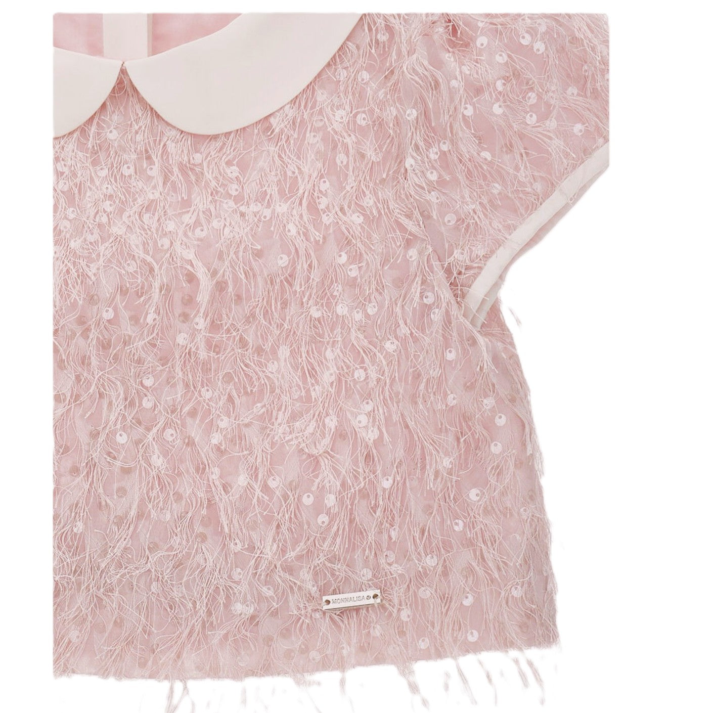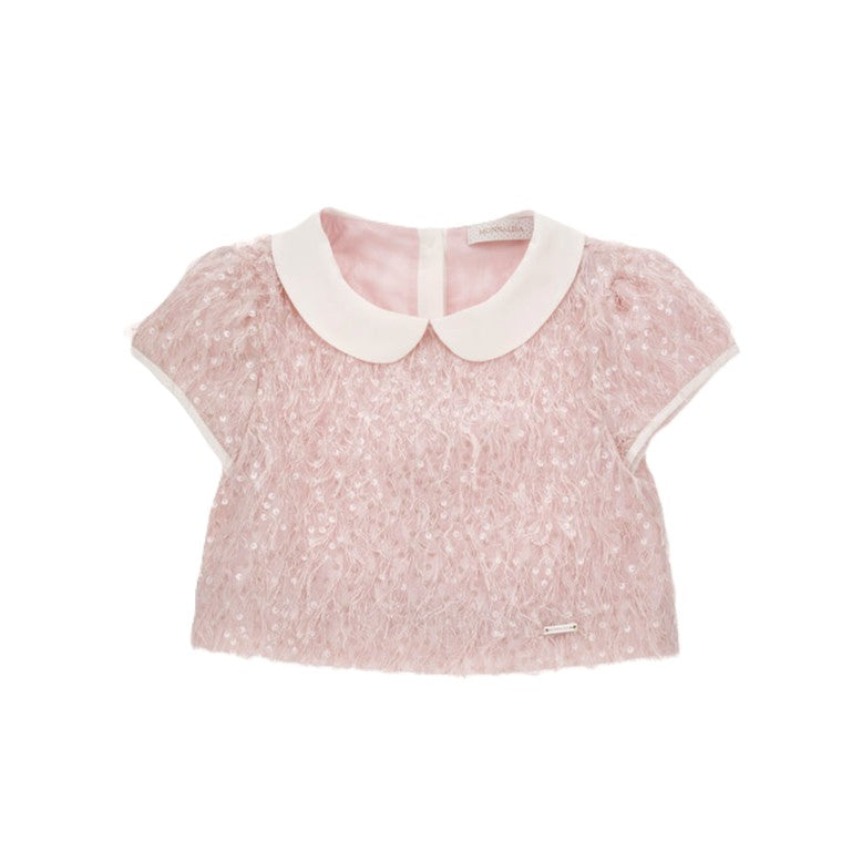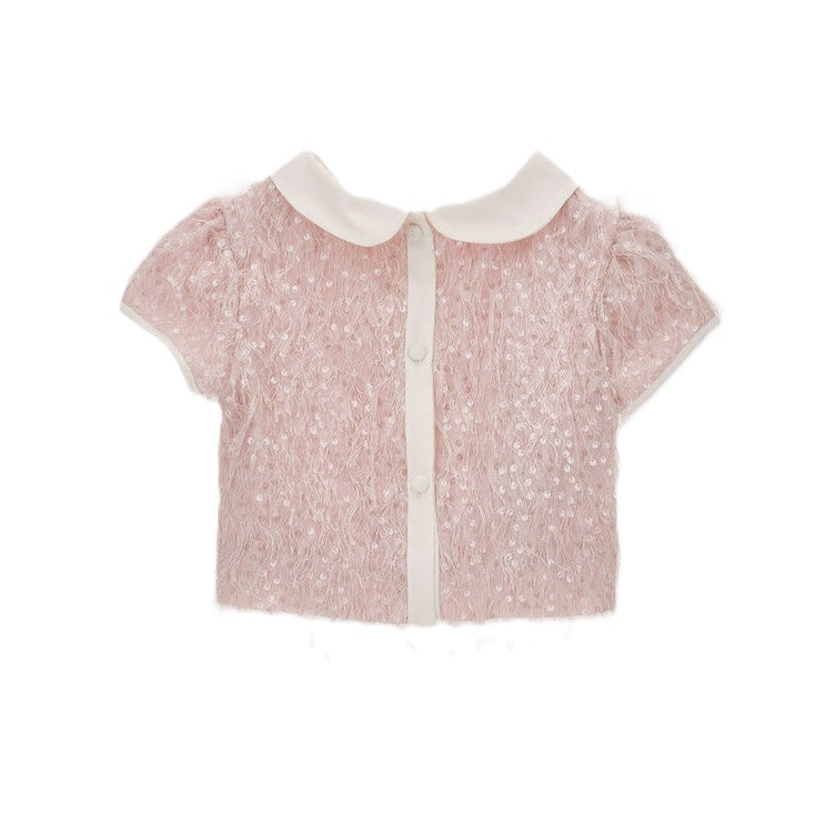 Top elegante in tessuto leggero impreziosito da pailettes e piume che catturano la luce con raffinatezza. Il colletto Peter Pan e le maniche corte regalano un'estetica bon ton sofisticata, mentre i bottoni gioiello sulla chiusura posteriore aggiungono praticità senza compromessi stilistici. La texture luminosa e il comfort del materiale lo rendono ideale per cerimonie, feste e occasioni speciali, trasformando ogni momento in un'opportunità per brillare con eleganza e glamour.