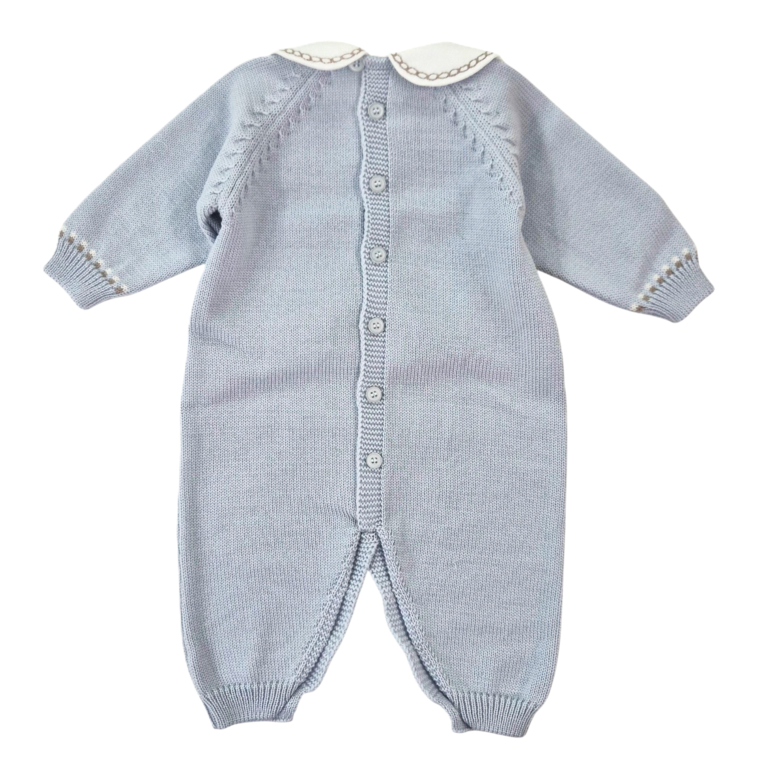 Realizzata in pura lana merino extrafine, questa tutina per neonato garantisce morbidezza e calore naturali, perfetti per la pelle sensibile del tuo bambino. Il colletto bianco in piquet con delicato ricamo, l’orso intarsiato sul petto e la sciarpetta applicata aggiungono eleganza e originalità. I dettagli a contrasto sui polsi completano il design, rendendo questa tutina la scelta ideale per la prima uscita clinica, con comfort e stile assicurati.