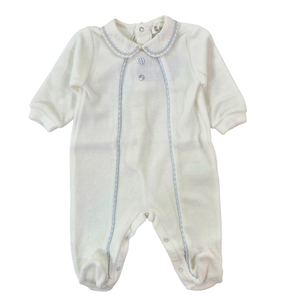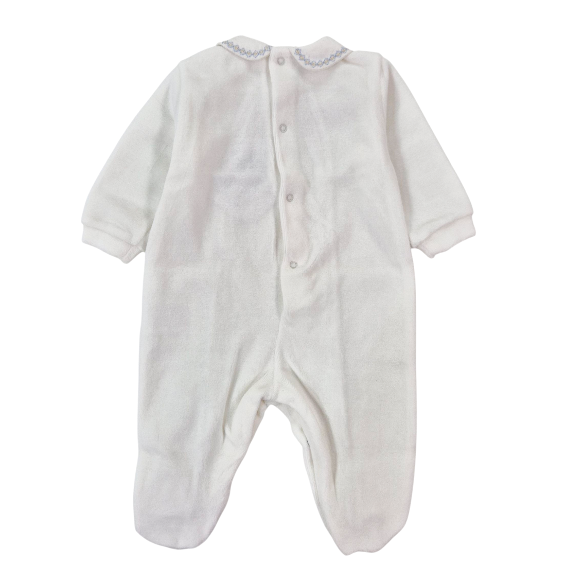 Questa tutina neonato in ciniglia offre una morbidezza e calore impareggiabili, perfetta per coccolare il tuo piccolo. Il ricamo delicato sul colletto e i dettagli color cielo sul davanti aggiungono un tocco di dolcezza e stile. Pratica e sicura, la chiusura sul retro e sul cavallo con clip facilita il cambio, garantendo comodità ogni giorno. Ideale per i primi mesi, un capo che unisce comfort e eleganza per i neonati.  NA=nascita 54cm   1m=58cm   3m=62cm