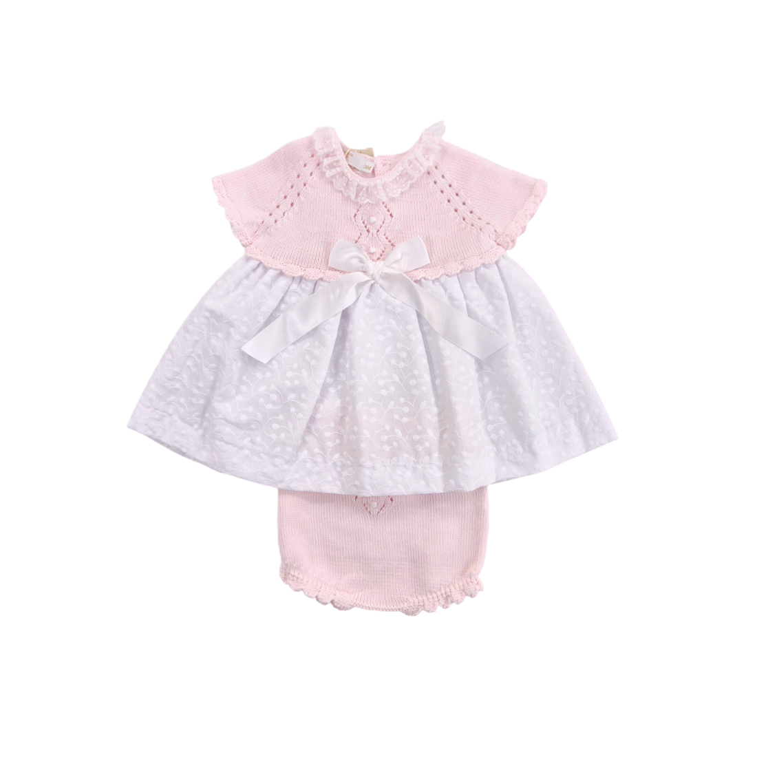 Delicato vestito neonata realizzato in filo cotone lavorato a maglia con eleganti trafori e ricami sul petto. Il girocollo è impreziosito da pizzo Valenciennes e un fiocchetto in vita aggiunge un tocco romantico. La gonna in cotone presenta un raffinato ricamo floreale ed è completamente foderata per il massimo comfort. Chiusura pratica con bottoni sul retro. Completo di culottina coordinata in filo cotone con elastico a costine e ricamo centrale. Perfetto per occasioni speciali.